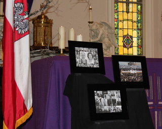 Ołtarz był udekorowany 3 zdjęciami pary prezydenckiej i pozostałych poległych; zdjęcia oprawione czarnymi ramami,