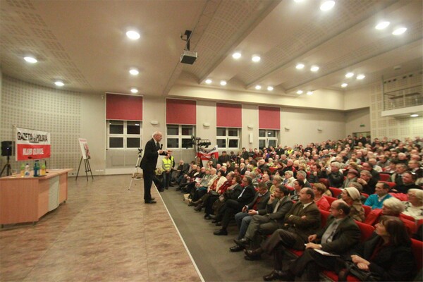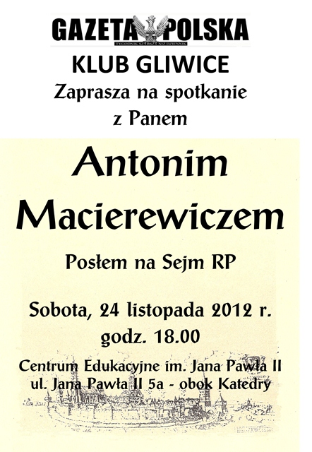 Mimo sobotniego wieczoru, największa sala Centrum Edukacyjnego im. Jana Pawła II wypełniła się po brzegi. Na zaproszenie Gliwickiego Klubu GP przyjechał Pan Poseł Antoni Macierewicz, witany długotrwałymi brawami na stojąco.