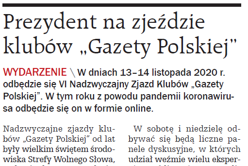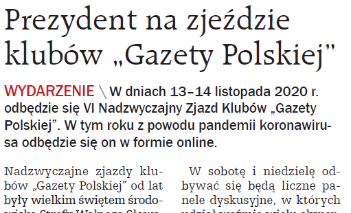 WYDARZENIE \ W dniach 13–14 listopada 2020 r. odbędzie się VI Nadzwyczajny Zjazd Klubów „Gazety Polskiej”. W tym roku z powodu pandemii koronawirusa odbędzie się on w formie online.