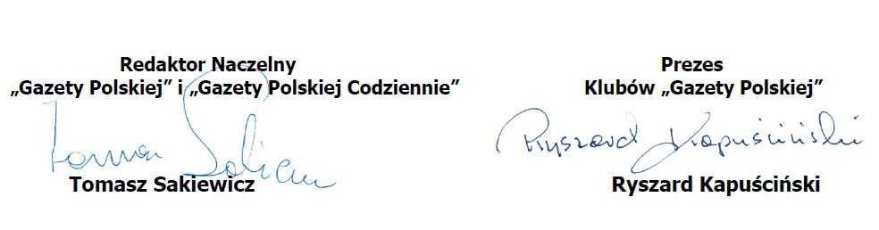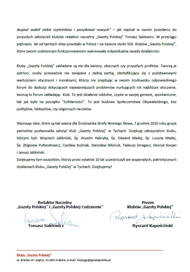 Z okazji 10 lat działalności Klubu „Gazety Polskiej” w Tychach chcemy Państwu podziękować za Waszą dotychczasową ciężką pracę dla dobra wolnej, suwerennej i bogatej Polski. Za Waszą pracę dla dobra swojej Małej Ojczyzny, w której mieszkacie, gdzie mieszkają Wasi znajomi. Za budowanie Społeczeństwa Obywatelskiego.