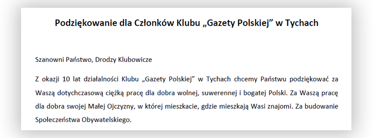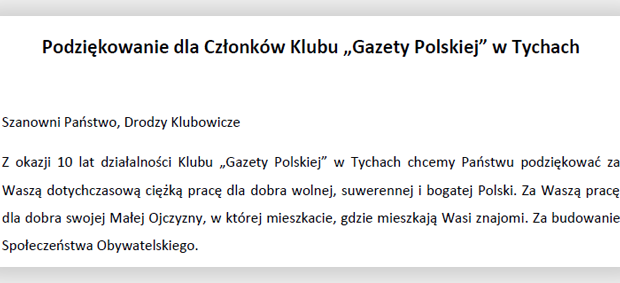 Podziękowanie dla Członków Klubu „Gazety Polskiej” w Tychach