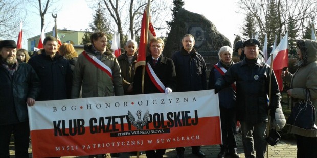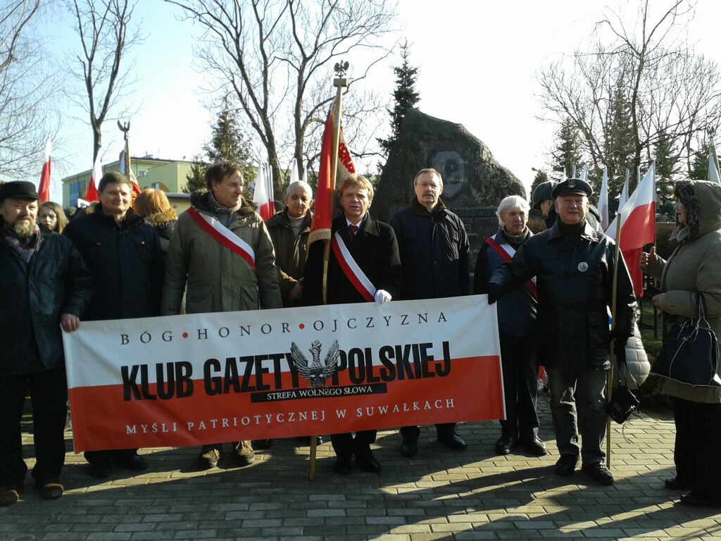 Klub Gazety Polskiej – Myśli Patriotycznej w Suwałkach przesyła zdjęcia – w załączeniu z obchodów Dnia Żołnierzy Wyklętych – Niezłomnych Bohaterów w Suwałkach 1.03.2015 r. Po Mszy Św. odprawianej przez ks. prałata Stanisława Wysockiego, ks. proboszcza Kazimierza Grybosia i kazaniu harcmistrza ZHR ks.Piotra Kępy odbył się marsz do pomnika Żołnierzy Armii Krajowej – z czynnym udziałem naszego klubu, który był współorganizatorem tych uroczystości.