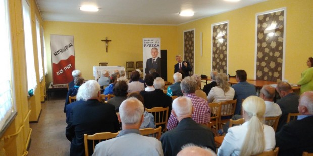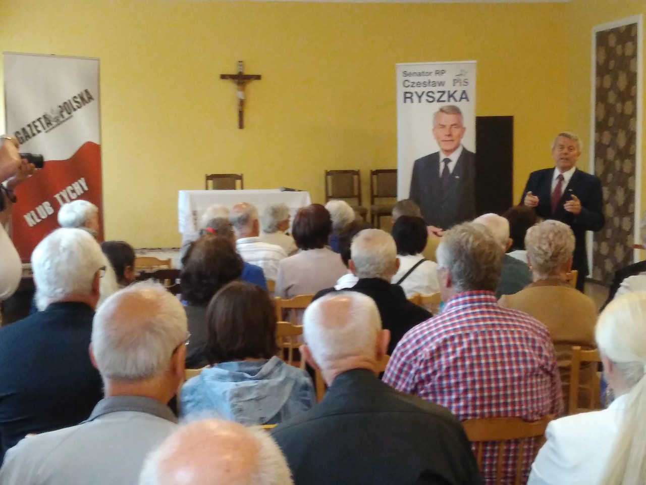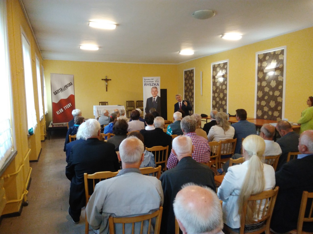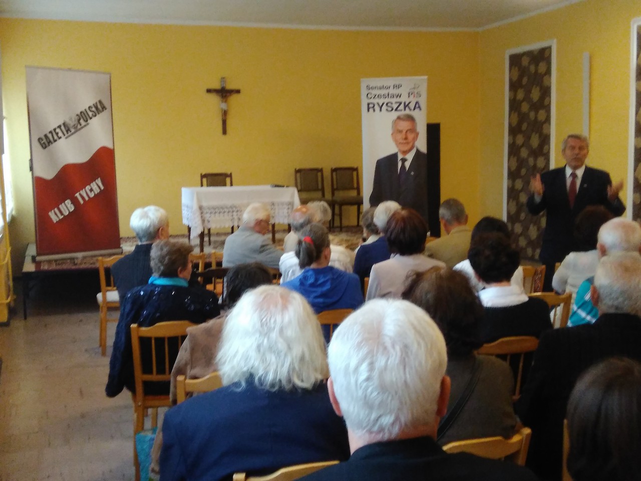 Klub Gazety Polskiej w Tychach oraz jego sympatycy zebrali się tym razem przed Mszą Św. Aby pod pomnikiem Smoleńsk 2010 uczcić pamięć o ofiarach tragedii smoleńskiej. Odprawiono krótką modlitwę za poległych i odczytano Apel Klubów GP. Wspomniano również o eksplozji nienawiści wobec tych, którzy upominają się co miesiąc o prawdę, o Smoleńsku. Przed 2010 rokiem stworzono i wytoczono prawdziwy przemysł pogardy wobec Prezydenta Lecha Kaczyńskiego, dzisiaj wytacza się przeciwko całej dużej grupie ludzi prawdziwy przemysł nienawiści. Przemysł nienawiści wobec tych, którzy upominają się o prawdę. Metody działania i eskalowanie konfliktów przez tzw. opozycję totalną oraz „bojówkę” pod nazwą „obywatele RP” nie mają precedensu w cywilizowanym świecie. Na koniec uroczystości odśpiewano hymn. Spod pomnika uczestnicy udali się na Mszę Św. w intencji Ojczyzny oraz ofiar tragedii Smoleńskiej. Po Mszy Św. odbyło się w sali Św. Maksymiliana spotkanie autorskie pt. Godzina Fatimy z Senatorem Czesławem Ryszką . Godzina Fatimy to tytuł najnowszej książki Senatora o objawieniach Fatimskich. Opowiadanie Senatora o objawieniach i sytuacji na świecie w czasach objawień było równie dobre jak książka, którą jeszcze niewielu klubowiczów miało okazje przeczytać. Książka jest bardzo ciekawa a niektóre rozdziały wręcz porywające. Po spotkaniu można było otrzymać dedykację Senatora Czesława Ryszki.