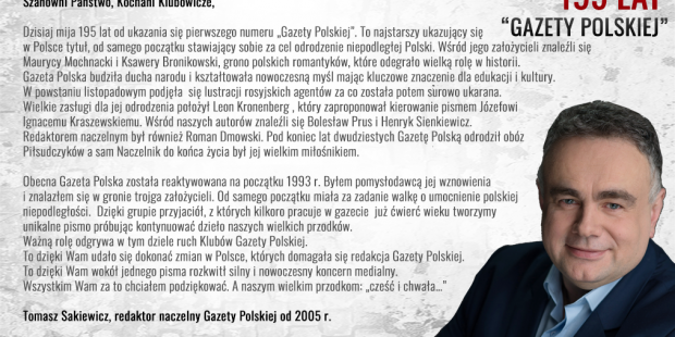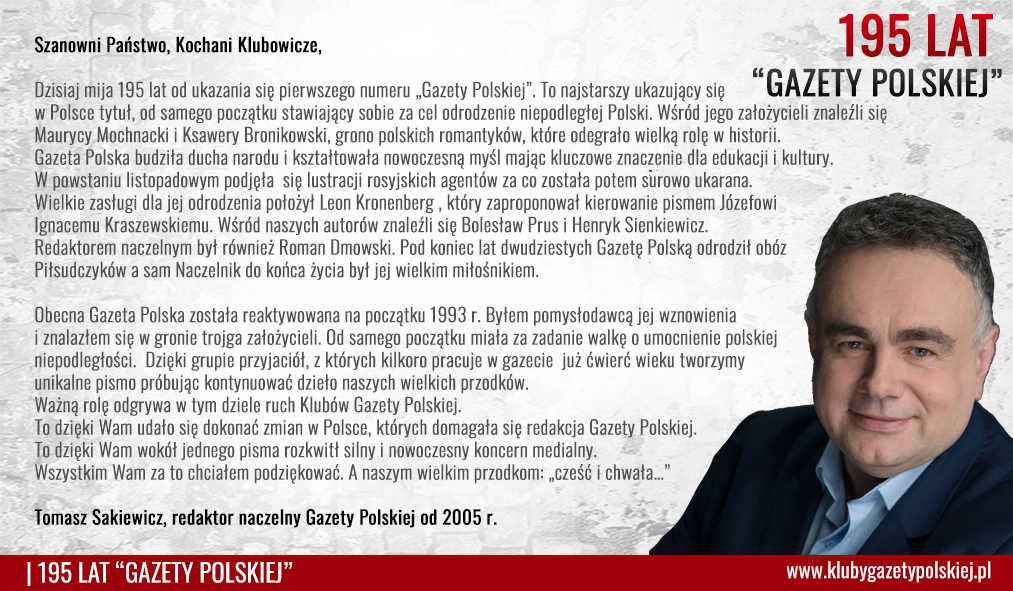 Walną rolę odgrywa w tym dziele ruch Klubów Gazety Polskiej. To dzięki Wam udało się dokonać zmian w Polsce, których domagała się redakcja GP. To dzięki Wam wokół jednego pisma rozkwitł silny i nowoczesny koncern medialny. Wszystkim Wam za to chciałem podziękować. A naszym wielkim przodkom: „cześć i chwała…”