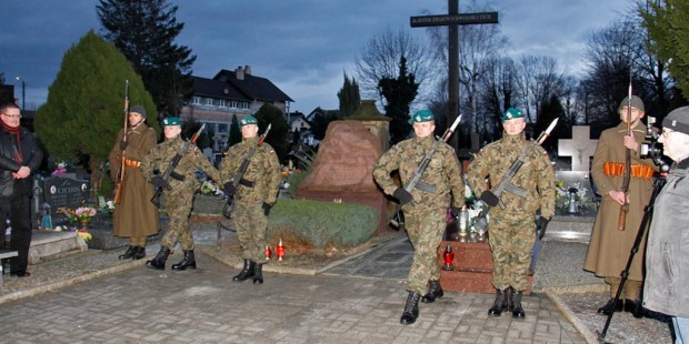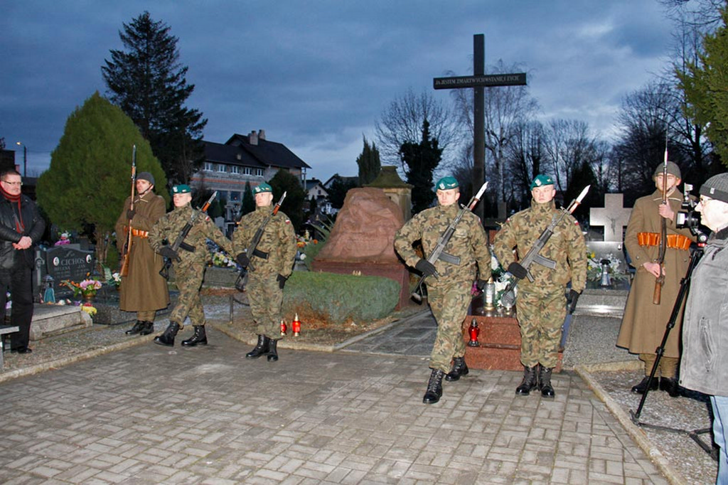 W mroźny styczniowy dzień w asyście honorowej żołnierzy 22 KBPG z Kłodzka oraz Grupy Rekonstrukcji Historycznej 58 pp (4 psw) w 71. rocznicę zamordowania trzech żołnierzy AK, spotkaliśmy się przy tablicy pamiątkowej na cmentarzu parafialnym, aby oddać IM hołd. Odmówiliśmy modlitwę w intencji rozstrzelanych, zapaliliśmy znicze pamięci oraz złożyliśmy wiązanki kwiatów.