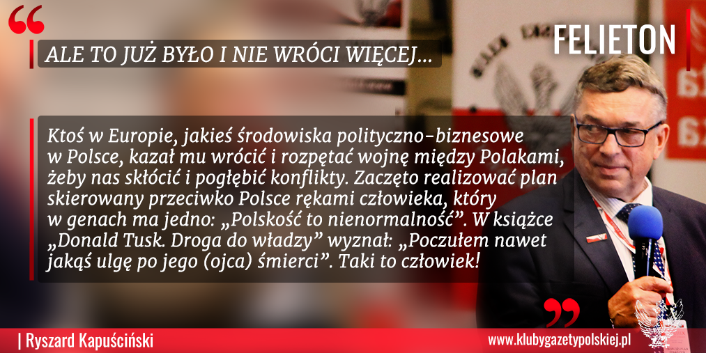 „Choć w papierach lat przybyło/To naprawdę wciąż jesteśmy tacy sami” – mógłby zaśpiewać piosenkę Maryli Rodowicz Donald Tusk podczas Rady Krajowej Platformy Obywatelskiej. Niestety, Tusk nic a nic się nie zmienił. Ktoś, kto po siedmiu latach wraca do Polski, bo za chwilę straci przywództwo w Europejskiej Partii Ludowej z powodu przejścia Angeli Merkel na emeryturę, w swoim pierwszym przemówieniu pokazał, jak nienawidzi Polski, jak nienawidzi Polaków. Jego wystąpienia słuchało się ze zdumieniem i przykrością. Nawet jego zwolennicy czuli zażenowanie poziomem agresji i kłamstwami, którymi przez 25 minut swojego przemówienia obrzucał PiS i Polaków. Każdym słowem, każdym gestem, obrażał inteligencję Polaków, mówiąc np. o czołgach wysyłanych przez rządzących na stare kobiety. Ktoś w Europie, jakieś środowiska polityczno-biznesowe w Polsce, kazał mu wrócić i rozpętać wojnę między Polakami, żeby nas skłócić i pogłębić konflikty. Zaczęto realizować plan skierowany przeciwko Polsce rękami człowieka, który w genach ma jedno: „Polskość to nienormalność”. W książce „Donald Tusk. Droga do władzy” wyznał: „Poczułem nawet jakąś ulgę po jego (ojca) śmierci”. Taki to człowiek!