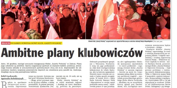 Jutro, 30 grudnia, nastąpi uroczysta inauguracja Klubu „Gazety Polskiej” w Zabrzu. Plany jego członków są ambitne. Oprócz organizacji spotkań ze znanymi ludźmi, prelekcji, aktywnego brania udziału w uroczystościach patriotycznych chcą oni m.in. doprowadzić do odnowienia kwatery wojennej powstańców śląskich na cmentarzu przy parafii św. Andrzeja. Znajduje się na niej pamiątkowa tablica.