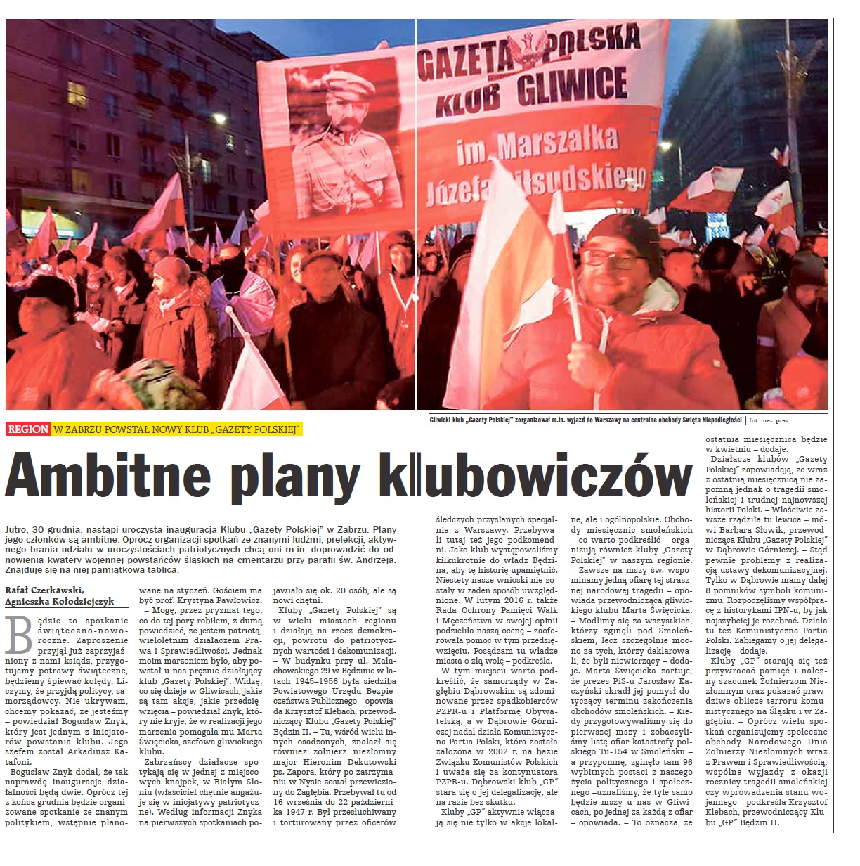 Kluby „Gazety Polskiej” są w wielu miastach regionu i działają na rzecz demokracji, powrotu do patriotycznych wartości i dekomunizacji. – W budynku przy ul. Małachowskiego 29 w Będzinie w latach 1945–1956 była siedziba Powiatowego Urzędu Bezpieczeństwa Publicznego – opowiada Krzysztof Klebach, przewodniczący Klubu „Gazety Polskiej” Będzin II. – Tu, wśród wielu innych osadzonych, znalazł się również żołnierz niezłomny major Hieronim Dekutowski ps. Zapora, który po zatrzymaniu w Nysie został przewieziony do Zagłębia. Przebywał tu od 16 września do 22 października 1947 r. Był przesłuchiwany i torturowany przez oficerów śledczych przysłanych specjalnie z Warszawy. Przebywali tutaj też jego podkomendni. Jako klub występowaliśmy kilkukrotnie do władz Będzina, aby tę historię upamiętnić. Niestety nasze wnioski nie zostały w żaden sposób uwzględnione. W lutym 2016 r. także Rada Ochrony Pamięci Walk i Męczeństwa w swojej opinii podzieliła naszą ocenę – zaoferowała pomoc w tym przedsięwzięciu. Posądzam tu władze miasta o złą wolę – podkreśla.