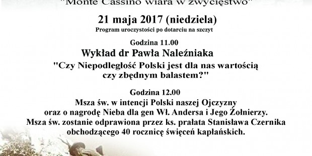 Andrychów II – IV Ogólnopolski Gwiaździsty Rajd Środowisk Patriotycznych na Groń Jana Pawła II (Leskowiec) 21 maja – IV Ogólnopolski Gwiaździsty Rajd Środowisk Patriotycznych na Groń Jana Pawła II (Leskowiec) w 73. rocznicę bitwy pod Monte Cassino „Monte Cassino wiara w zwycięstwo” maj 12, 2017 Kluby GP Andrychów II Tagged Andrychów II Wstecz Szczecin – VI Szczecińskich Dni Przyjaźni Polsko-Węgierskiej Dalej Dzierżoniów II – Zaproszenie na odsłonięcie pomnika Żołnierzy Wyklętych