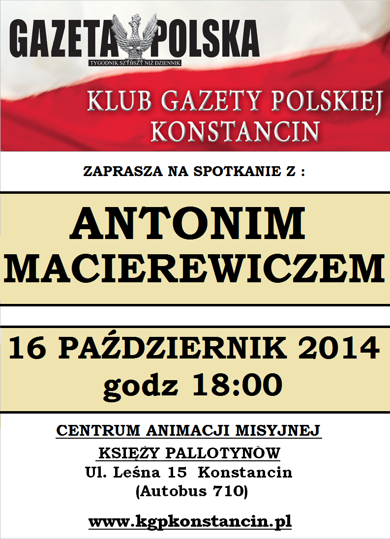Konstancin – Jeziorna – spotkanie z posłem Antonim Macierewiczem, 16 października, g. 18, Centrum Animacji Misyjnej  ul. Leśna 15.