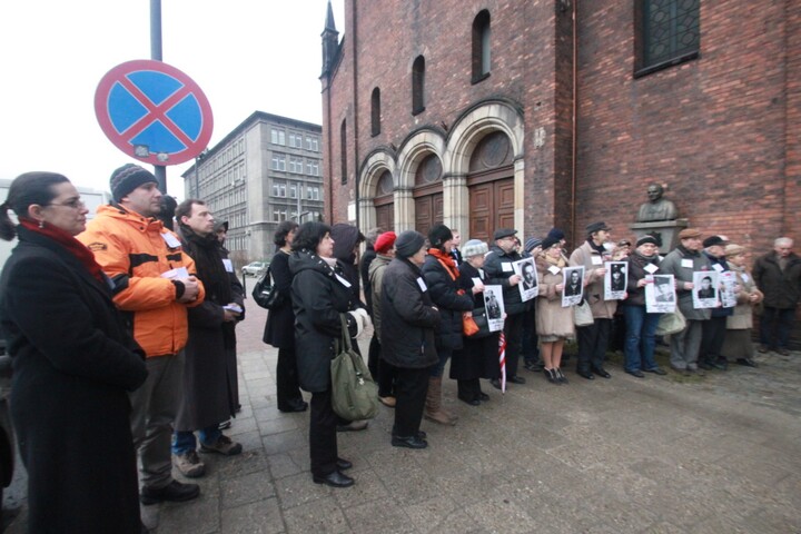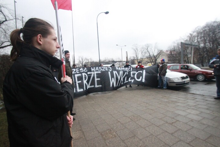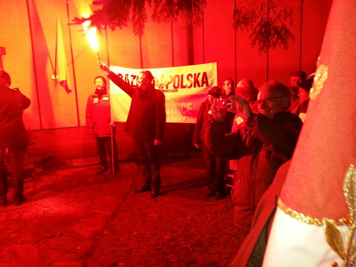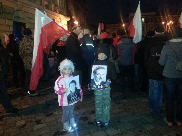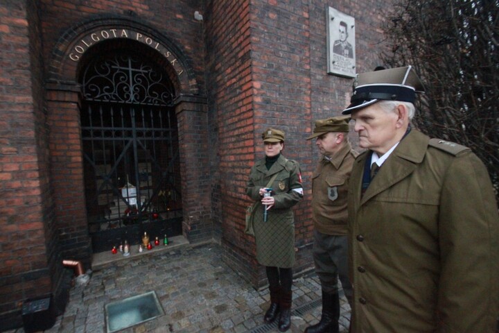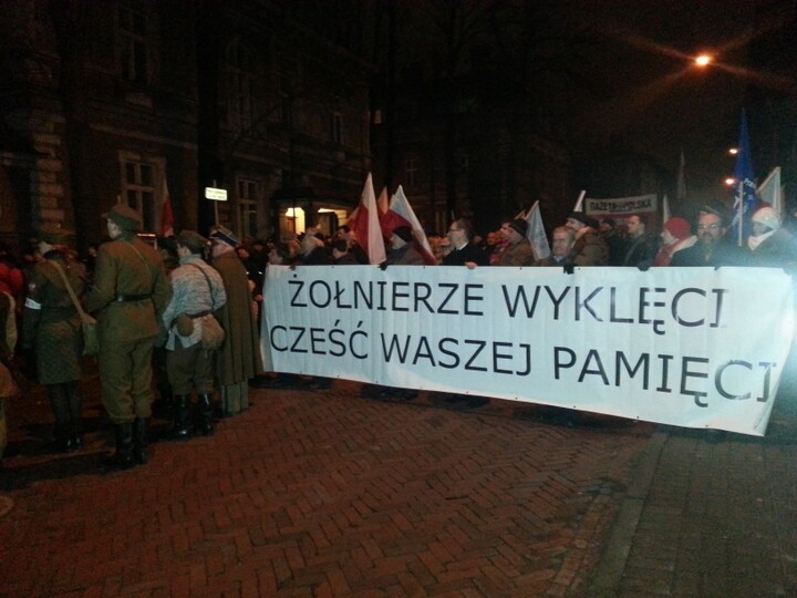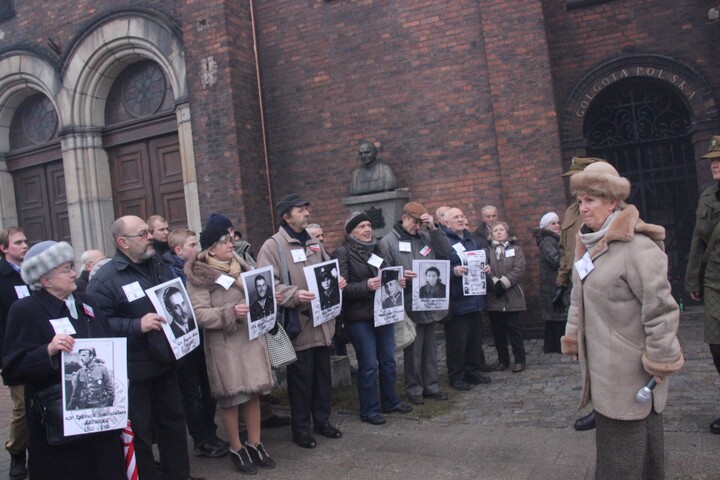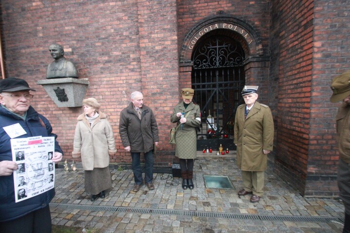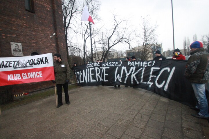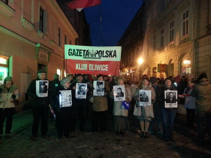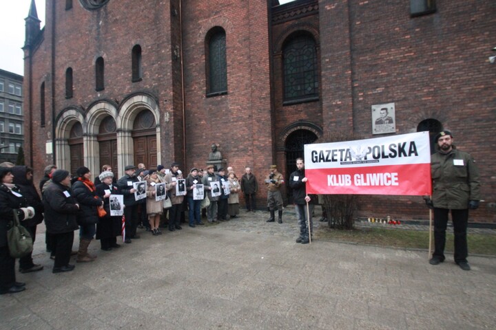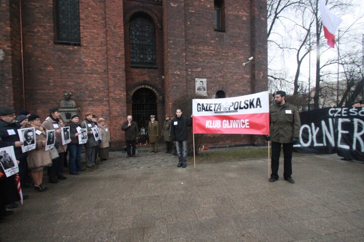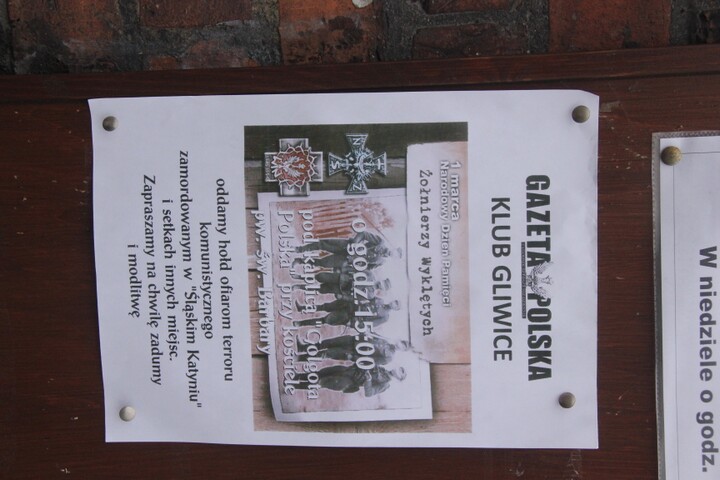 1 marca w 60 rocznicę zamordowania w tymże mokotowskim więzieniu IV Zarządu WiN, zebraliśmy się pod "Golgotą Polską" z tablicą pamięci "Żnierzy Wyklętych". Przyszło sporo sympatyków Gliwickiego Klubu Gazety Polskiej, w tym grupa młodzieży i kibiców "Piasta Gliwice" z dużym transparentem i pochodniami. Krótkie wystąpienie kol. Mariusza Warachima, modlitwa, znicze i gromkie okrzyki Chwała Bohaterom! W spotkaniu uczestniczył żołnierz Brygady Świętokrzyskiej NSZ por.Stanisław Turski oraz grupa rekonstrukcyjna NSZ. Po dwóch godzinach jazdy, nasza delegacja, zaproszona przez posła PiS, Pana Stanisława Piętę, przybyła do Bielska Białej na Marsz Żołnirzy Wyklętych. W profesjonalnie zorganizowanym marszu, duże i rodosne wrażenie wywarła młodzież, stanowiąca ok. 75% kilkutysięcznej rzeszy uczestników. Na zakończenie Msza Święta i homilia patriotyczno-religijna ks. Stanisława Ryżki, proboszcza parafii pw. Najświętszego Serca Pana Jezus, nagrodzona przez wiernych brawami. Po Mszy św. złożono kwiaty pod tablicą smoleńsdką, na zewnętrznej ścianie kościoła. Późnym wieczorem ugościł nas Pan poseł Pięta, aranżując spotkanie dotyczące współpracy PiS-u i klubu bielskiego z gliwickim .