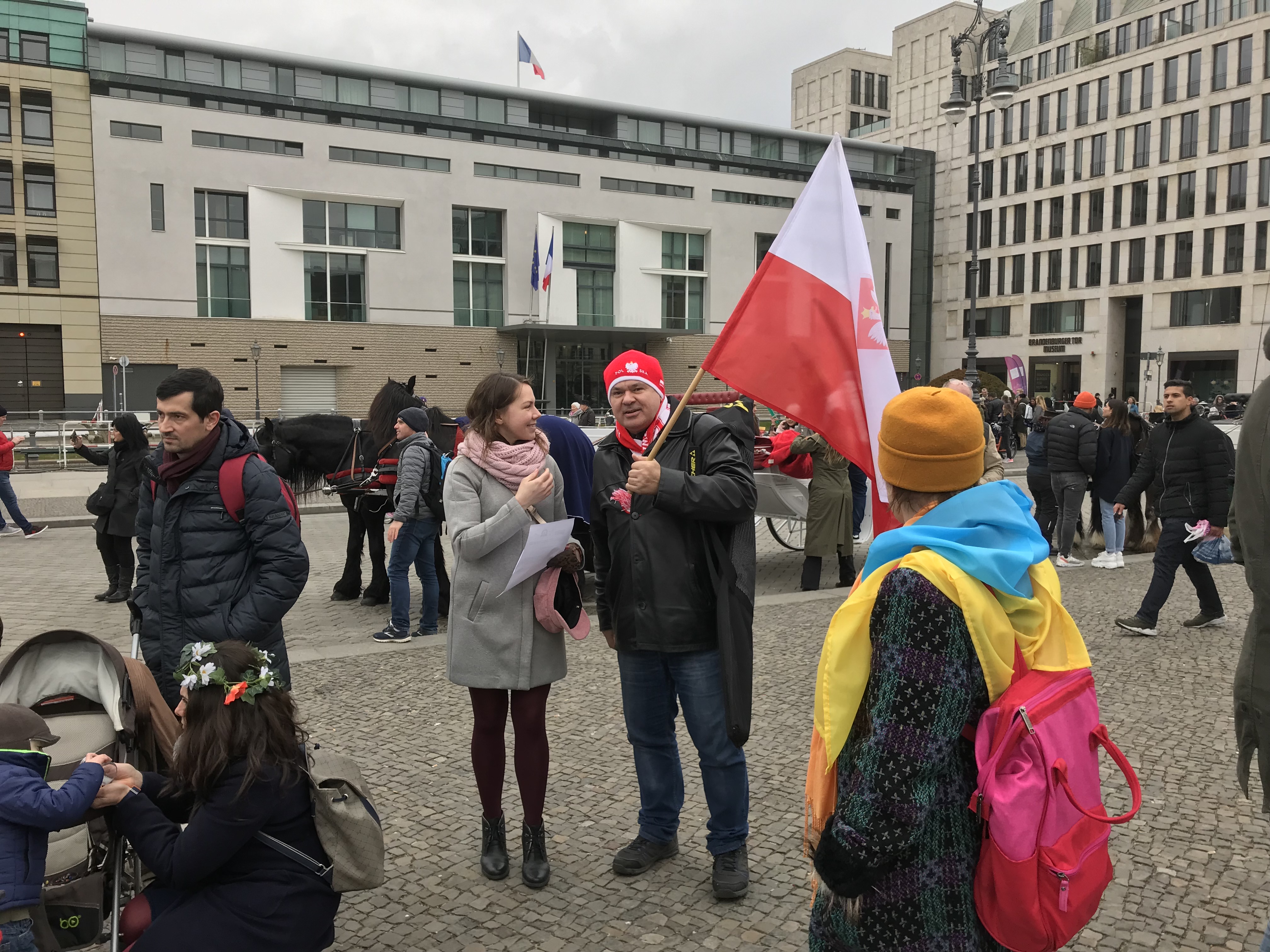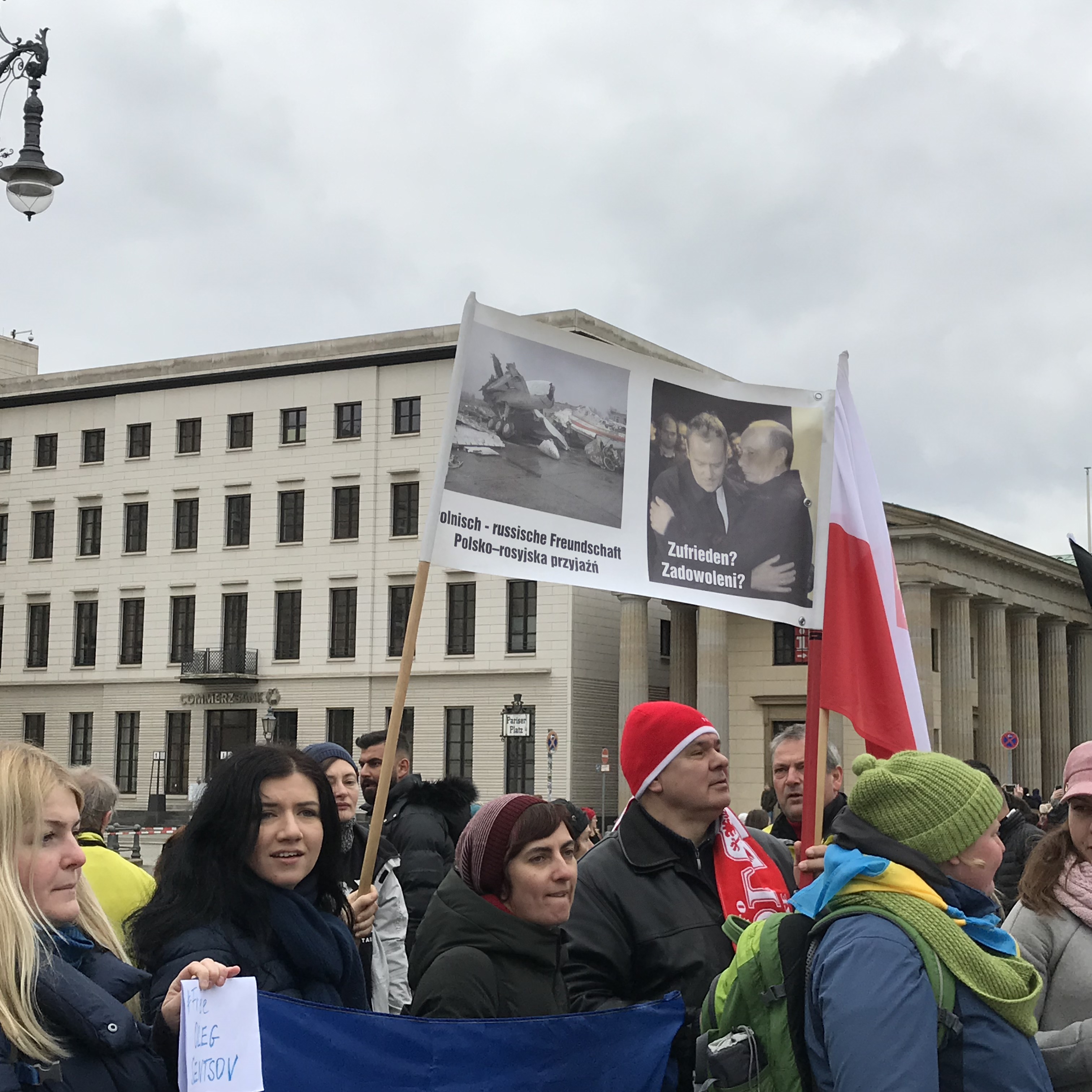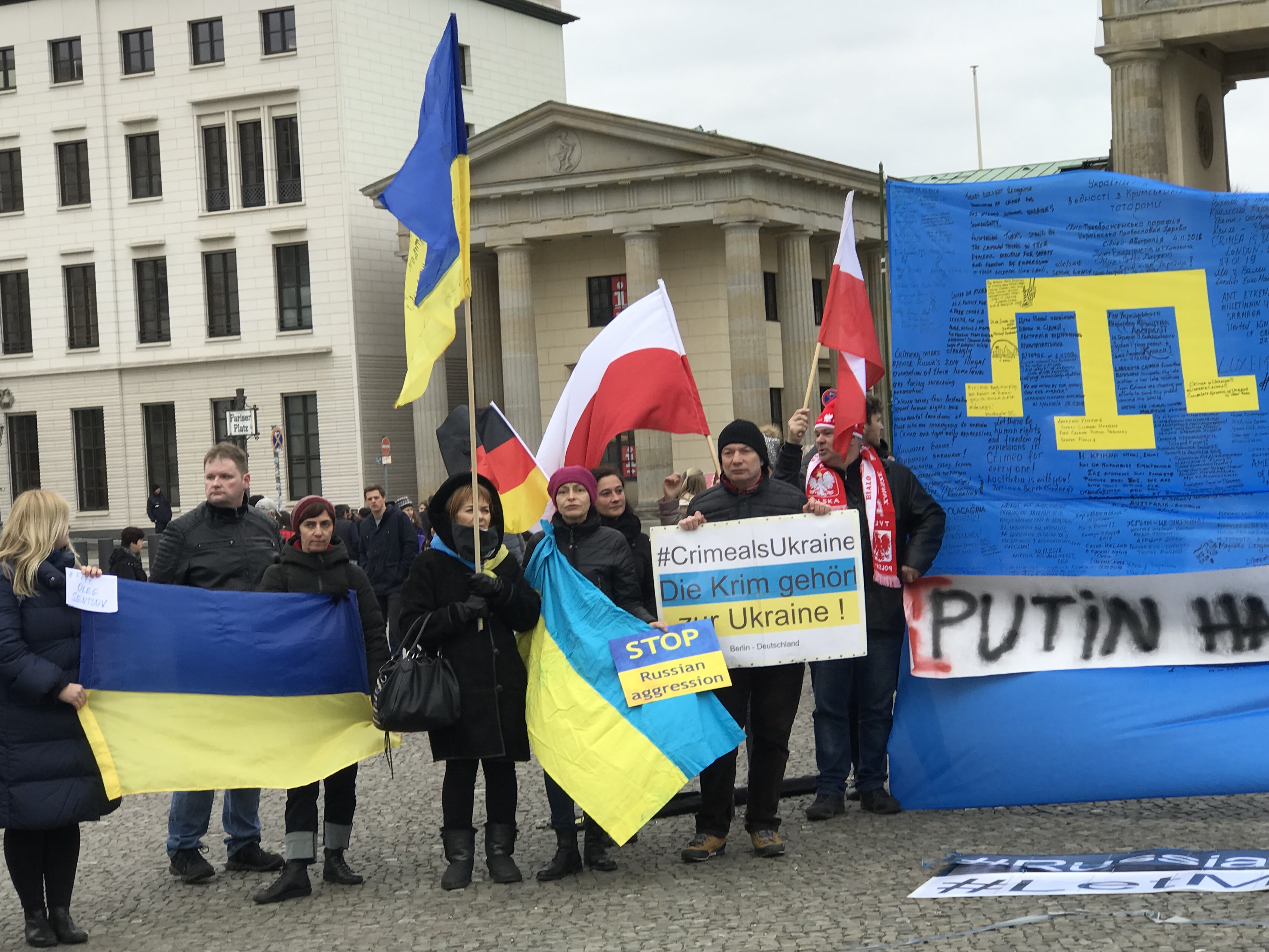 W sobotę dnia 2 marca 2019 roku zorganizowała ukraińska diaspora  demonstrację w Berlinie naprzeciwko  Bramy Brandenburskiej przeciwko zbirom Putina, okupującym ukraiński Krym, zaanektowany przez Federację Rosyjską w 2014 roku. W piątym roku aneksji ukraińskiego Krymu przez Rosję w ramach kampanii „połączona flaga” Ukraińcy poprzez demonstrację uświadamiają społeczeństwa Europy Zachodniej o okupacji Krymu i o więźniach przebywających w putinowskich kazamatach. Imiona i nazwiska  prześladowanych Ukraińców i Tatarów przez siepaczy Putina pojawiły się na kartkach położonych na placu przed Bramą Brandenburską i na ogromnych banerach. Klubowicze Gazety Polskiej Berlin-Brandenburg wspomogli słuszny protest Ukraińców. Przynieśli polskie flagi i baner informujący o  upozorowanej katastrofie lotniczej pod Smoleńskiem,gdzie 10.04.2010 zamordowani zostali śp.Pan Prezydent Lech Kaczyński z Małżonką i 94 Polaków, który wzbudził duże zainteresowanie przechodniów i uczestników protestu. Nieopodal zgromadzenia Ukraińców i ich wspomagających osób pojawiła się mała, krzykliwa  grupa pogrobowców komunizmu i zwolenników rosyjskiego satrapy. Należy się podziękowanie niemieckiej  policji za  dobrą i skuteczną ochronę  uczestników protestu.