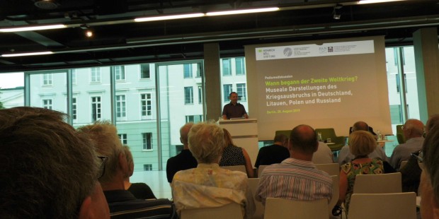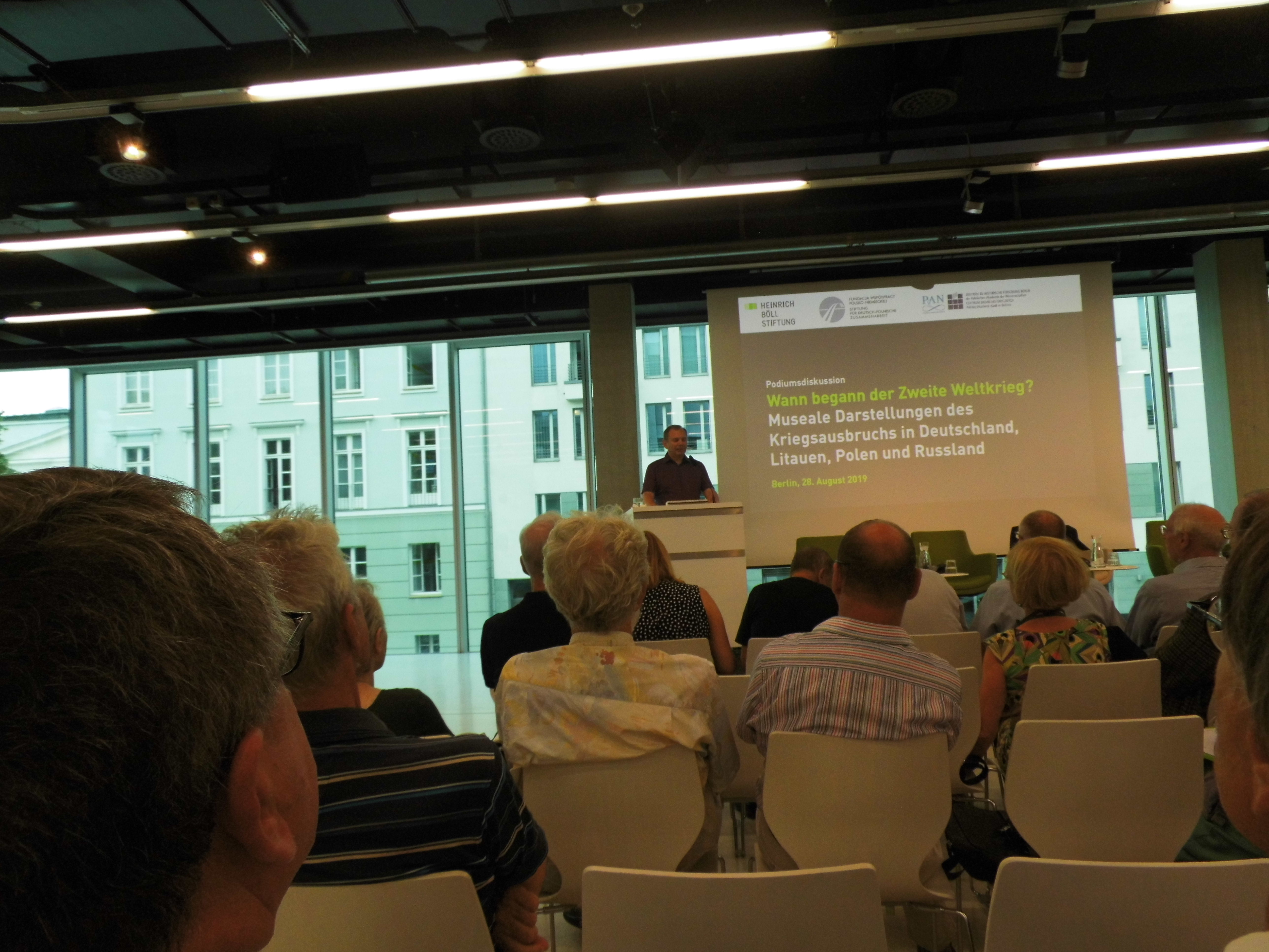 Po powitaniu przez przedstawicielkę fundacji Böll panią Ninę Happe,pana Corneliusa Ochmanna z fundacji Współpracy Polsko-Niemieckiej i panią Zofię Wóycicką z Centrum Badań Historycznych PAN w Berlinie w dniu 28.08.19 , zaproszonych gości i prelegentów na podium pojawili się moderator i czterej dyskutanci .Całą dyskuję moderował w języku niemieckim(tylko jedno pytanie zadał szeptem po polsku prelegentowi z Rosji) znany dziennikarz z berlińskiego Tagesspiegel pan Christoph von Marschall,biegle mówiący po polsku, żonaty z Polką. Dobór rozmówców nie był przypadkowy, co jest oczywistością na spotkaniach w RFN. Z Polski przyjechał Paweł Machcewicz polski historyk,do kwietnia związany z Muzeum II Wojny obecnie pracuje w Polskiej Akademii Nauk w Warszawie. Oczywiście, że jak nadarzyła się okazja po sformułowanym pytaniu prowadzącego to ostro zaatakował rząd dobrej zmiany i Pana Prezesa Jarosława Kaczyńskiego oraz mijał się z prawdą wobec patriotycznych żołnierzy NSZ i Brygady Świętokrzyskiej nazywając ich kolaborantami Niemców. Spotkał się z ripostą członka klubu Gazety Polskiej Berlin-Brandenburg,czego zapewne się nie spodziewał. Celnie i merytorycznie w nieco humorystyczny sposób w języku polskim odpowiadał na pytania arbitra pan Aleksy Vasilyev z Wyższej Szkoły w Moskwie.Niezbyt precyzyjne i niedokładne wg jednego z gości zadającego pytania, były odpowiedzi pani Ekateriny Makhotiny z Instytutu Historii Uniwersytetu w Bonn.Rzeczowo i precyzyjnie prezentował swoje wypowiedzi na postawione pytania moderatora pan Jórg Morre z Niemiecko-Rosyjskiego Muzeum Berlin- Karlshorst.Oczywiście, także wg prelegentów II wojna światowa wybuchła 1 września 1939 roku barbarzyńską napaścią hord niemieckich-nazistowskich na osamotnioną i zdradzoną przez rządy Francji i Anglii II RP. Pomogli hitlerowcom sowieccy stalinowscy siepacze wbijają nóz w plecy broniącej niepodległości Polski krwawiącej armii polskiej wkraczając i zajmując 17 września 1939 roku wschodnie tereny Rzeczpospolitej.Polska jako pierwsza postawiła tamę z krwi i dobytku obu agresorom w 1939 roku.Prawie dwa lata od 17.09.1939 do 22.06.1941 zbrodniarze spod znaku swastyki oraz sierpa i młota grabili,gwałcili,mordowali obywateli II RP, zanim sami wzięli się za przysłowiowe kudły, bestie Hitler i Stalin, jak to często bywa między bandytami-paserami.