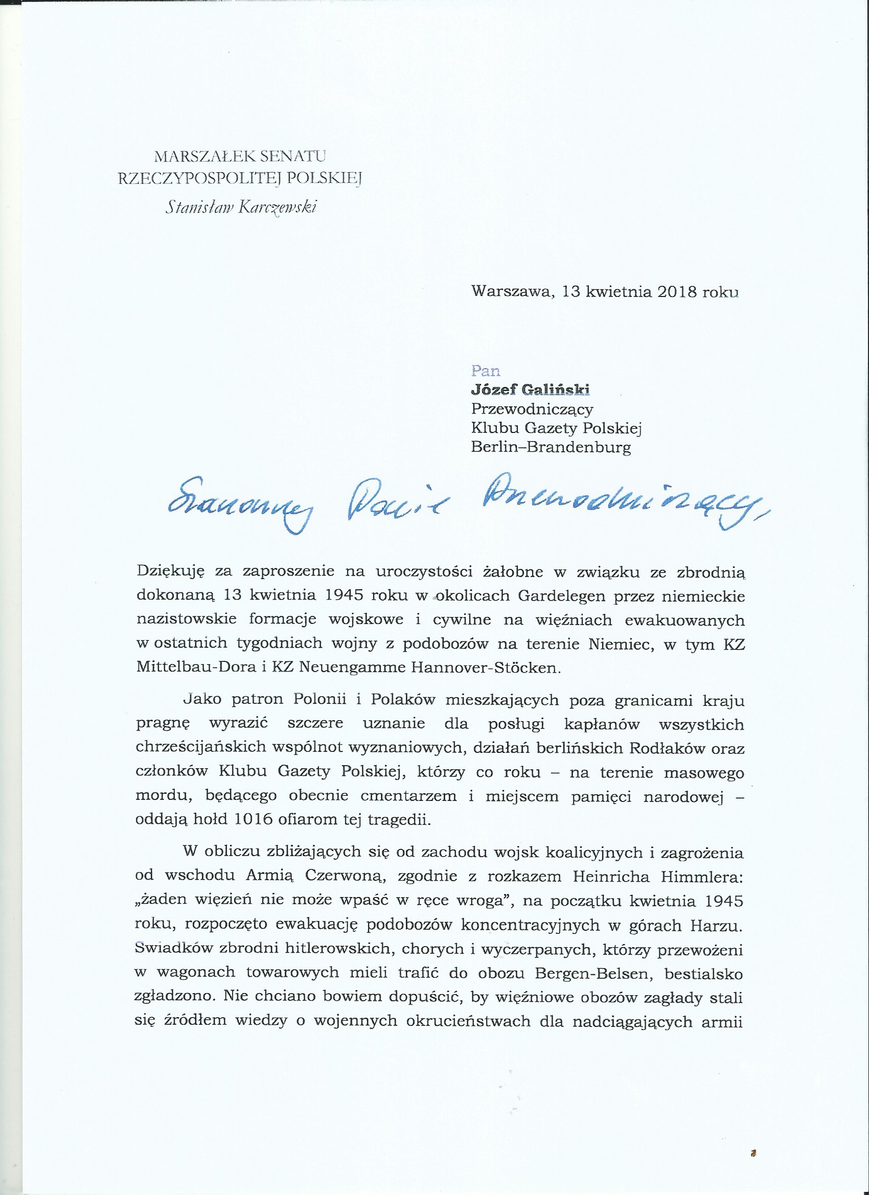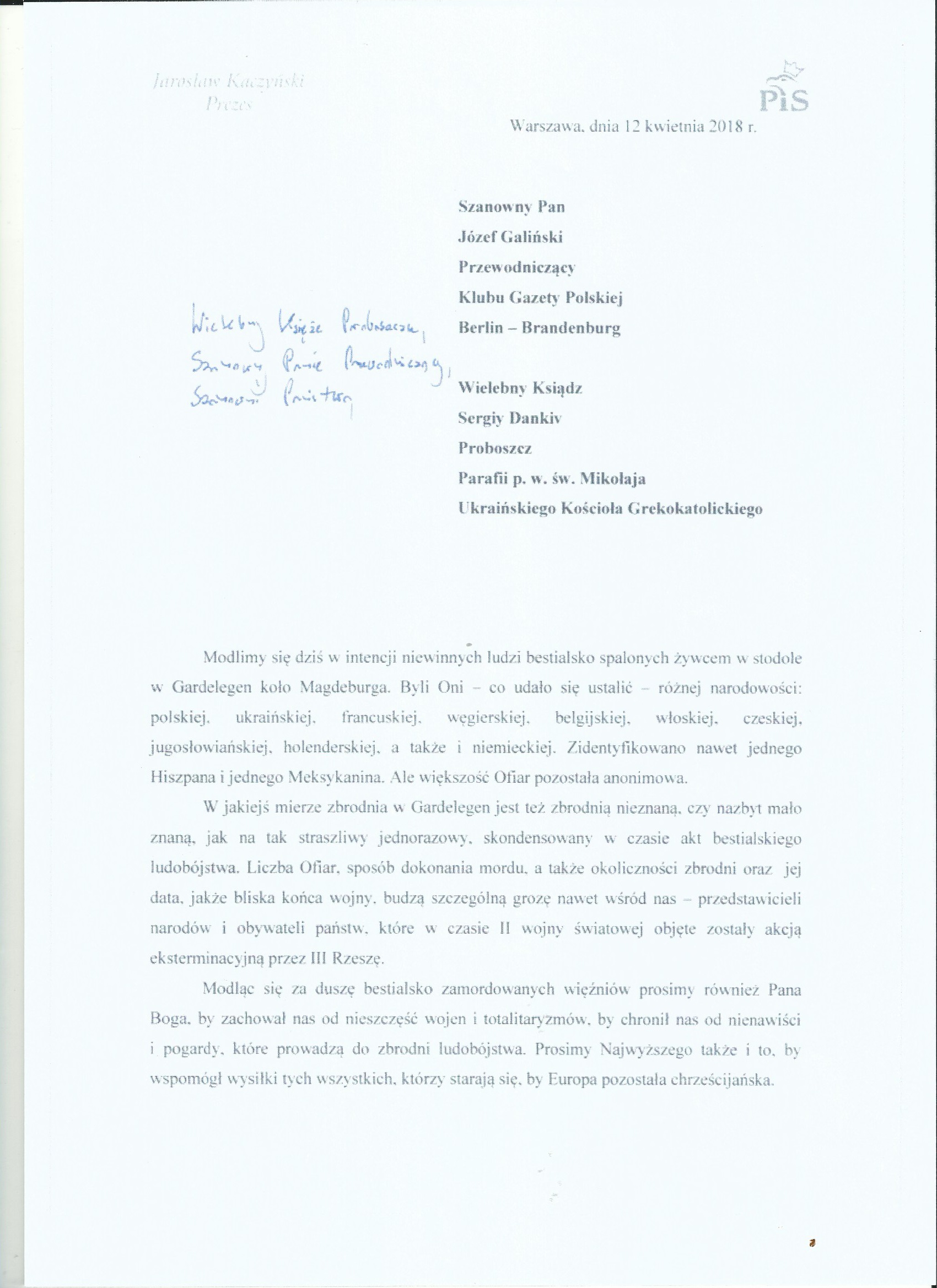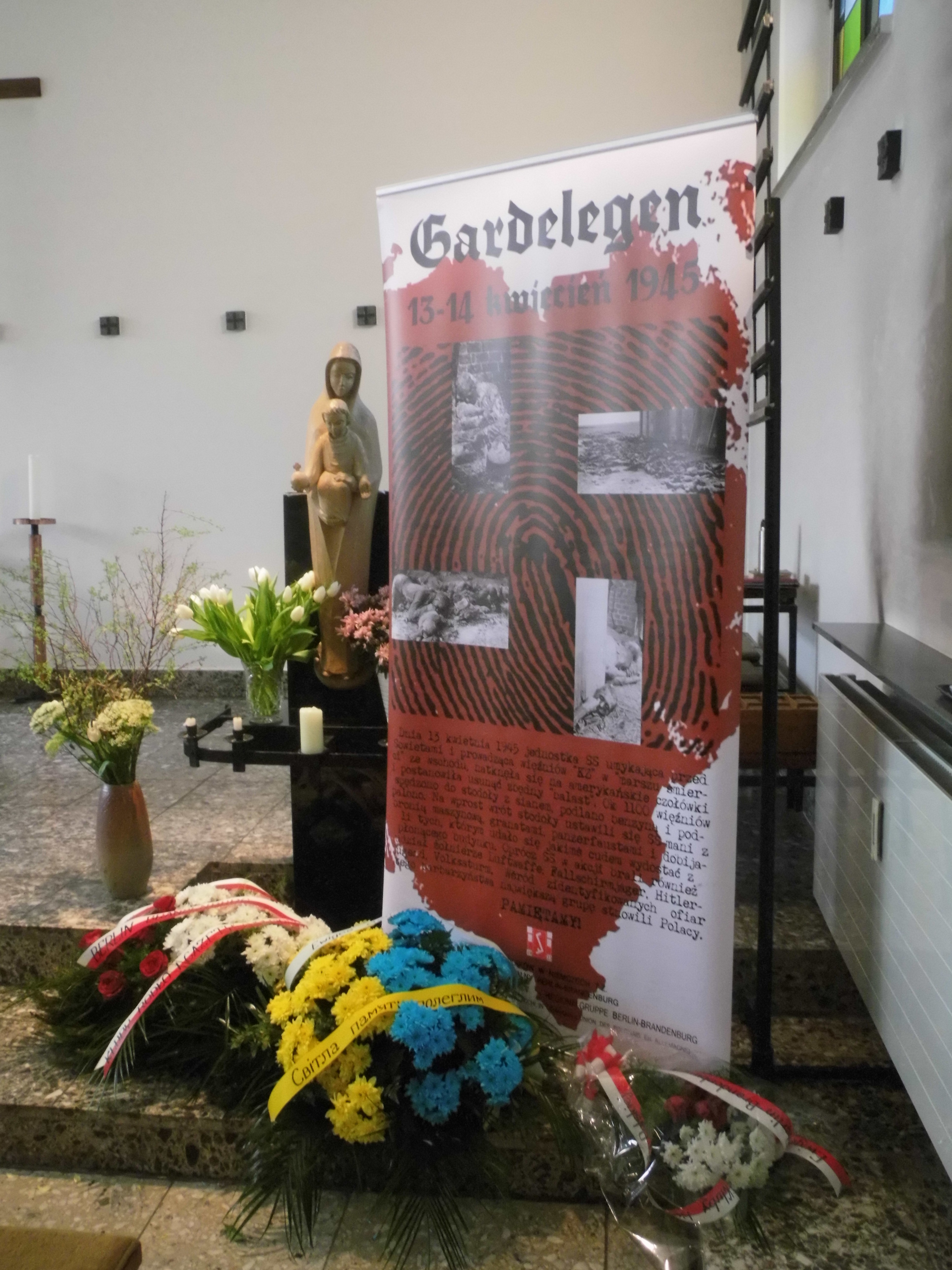 i Parafia Ukraińska zamówiły Mszę świętą za ofiary tej zbrodni. Msza św.była celebrowana o godzinie 10:00, w dniu 15. kwietnia 2018 roku w w Parafii pw. św. Mikołaja, Ukraińskiego Kościoła Grekokatolickiego przy niemieckiej rzymskokatolickiej wspólnocie parafialnej św. Jana Ewangelisty w Berlinie, przez ks. proboszcza Sergiya Dankiva .Czcigodny Ksiądz Proboszcz Sergiy wygłosił wzruszające kazanie i podziękował organizatorom uroczystości.W Mszy św.oprócz wiernych uczestniczyli przedstawicielka dyplomatyczna z Ambasady Ukrainy w Berlinie pani dr Iryna Tybinka , przybyła specjalnie na tę okazję, pani Krystyna Maciejewska z rodziną ,piosenkarka z Częstochowy,żona śp.znanego i cenionego piosenkarza Janusza Gniatkowskiego ,byłego członka AK a później Armii Polskiej,rannego w czasie walk z Niemcami , przybyła specjalnie na tę okazję, delegacja z Polski, z Klubu Rodło Szczecin z panem prezesem Andrzejem Lindeckim ,przedstawiciele ZPS z panem prezesem Lechem Prieff .Pani radca Ambasady RP Magdalena-Zacharska-Pietras złożyła wieniec przed pomnikiem spalonych żywcem niewinnych ludzi w Gardelegen.Specjalne listy przysłali pan Prezes PiS Jarosław Kaczyński i pan Marszałek senatu RP Stanisław Karczewski. Ksiądz Sergiy poświęcił przepiękne wieńce, które przez cały czas trwania Mszy św.leżały przed ołtarzem. Po Mszy św. i krótkim spotkaniu przy kawie , herbacie i napojach chłodzących oraz smacznym cieście, owocach w salce parafialnej uczestnicy Eucharystii pojechali na cmentarz w Gardelegen gdzie po modlitwie złożono wieńce i wiązanki kwiatów przy pomniku upamiętniającym to wydarzenie.W wynajętej sali restauracji Piano Forte uczestnicy uroczystości ,którzy byli w Gardelegen po wyczerpującej podróży spożyli smaczny posiłek,słuchając wspomnień znanej piosenkarki pani Krystyny.Degustacja smacznego tortu z flagami Ukrainy i Polski z białej czekolady zakończyła tę podniosłą uroczystość. Polakom i Ukraińcom nie są za bardzo znane tamte fakty. Niezwykle dramatyczny opis tamtych wydarzeń w Gardelegen dał Melchior Wańkowicz, który długo zbierał materiały do swojego felietonu i solidność jego pióra może być gwarantem prawdziwości świadectwa o tym co się strasznego w Gardelegen wówczas wydarzyło.