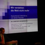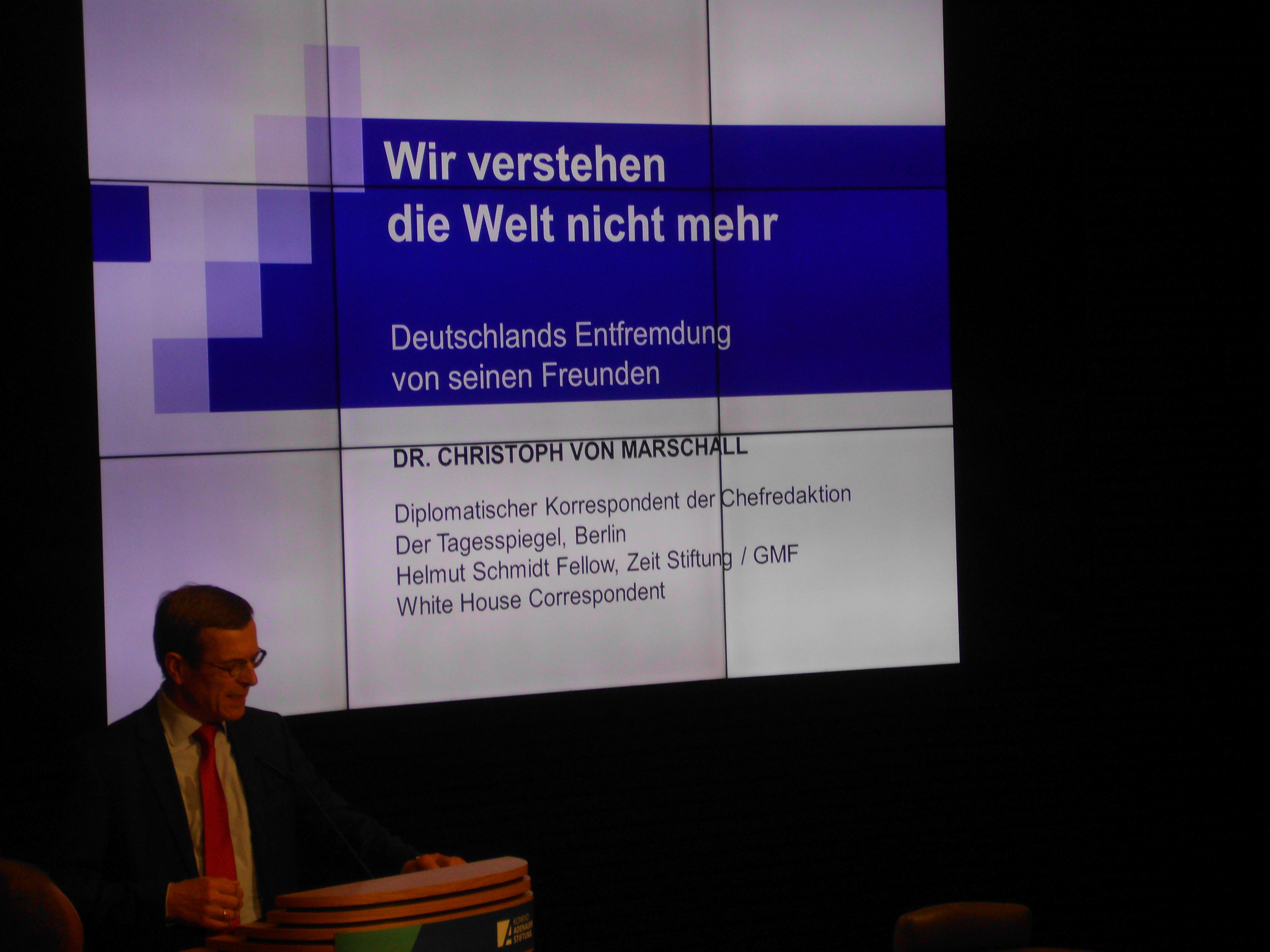 Do bardzo ciekawej dyskusji doszło w fundacji Konrada Adenauera dnia 15.10.18.r. w Berlinie ,w związku z prezentacją książki Pana dr Christopha von Marschalla.Autor książki jest znanym niemieckim korespondem „Der Tagesspiegel” i został zaproszony wspólnie z panem posłem do Bundestagu dr Norbertem Röttgenen do prezentacji i dyskusji o książce „Wir verstehen die Welt nicht mehr. Deutschlands Entfremdung von seinen Freunden-Przestaliśmy rozumieć świat.Alienacja Niemiec od przyjaciół “.Błędem organizatorów był fakt,że nie można było pozyskać egzemplarza książki a zatem i autografu dr Christopha von Marschalla.Sednem książki są obserwacje mistrza słowa ,który poprzez pryzmat rozmów z przedstawicielami różnych krajów (Francji,Polski,Belgii ,USA itd.) ukazał jak postrzegają Niemcy i ich politykę zagraniczną ich partnerzy z UE i USA.Oczywiście mistrz pióra podkreśla ,że w zasadniczych sprawach polityki zagranicznej Berlin nie jest wiarygodnym partnerem dla zaprzyjaźnionych krajów.