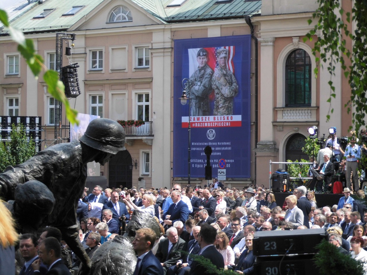 6 lipca 2017 roku  w Warszawie na placu Krasińskich wygłosił przemówienie Pan  Prezydent Stanów Zjednoczonych Donald J. Trump. Prezydent USA przybył wieczorem do Warszawy w dniu 5 lipca 2017 roku wraz z Małżonką Melanią, córką Ivanką i zięciem Jaredem Kushnerem oraz  sztabem doradców. Zamieszkał w hotelu Marriott. Pomimo, iż  przemówienie amerykańskiego prezydenta zaplanowane było na wczesne popołudnie, zarówno mieszkańcy Warszawy, jak i osoby, które chciały zobaczyć Donalda Trumpa na żywo, już we wczesnych godzinach porannych zgromadziły się dookoła warszawskiego placu Krasińskich. Bramki zostały otwarte o godzinie 10:00 i znajdowały się w trzech miejscach: od ul. Miodowej między ul. Schillera i ul. Kapucyńską, na rogu ul. Świętojerskiej i ul. Bonifraterskiej i od ul. Długiej obok ul. Barokowej. Ze względu na bezpieczeństwo i wygodę wszystkich uczestników wydarzenia zakazane było wnoszenie przez bramki wielu przedmiotów. Przy punktach kontroli systematycznie przybywało chętnych do zobaczenia przywódcy USA. Powiewały zarówno polskie, jak i amerykańskie flagi, wielu trzymało zaproszenia. Na ulicy widać było nie tylko amerykańskich żołnierzy, którzy stanowili nie lada atrakcję i Polacy chętnie robili sobie z nimi wspólne zdjęcia, przed wejściem na plac Krasińskich. Wzdłuż części ulicy Miodowej stały wozy transmisyjne rożnych stacji telewizyjnych, a dziennikarze rozmawiali z ludźmi oczekującymi przed bramkami wejściowymi. Wielu podkreślało w rozmowie, że wizyta  Pana Trumpa to najlepsza reklama Polski w świecie i fakt, że wybrał Polskę to ogromny zaszczyt  dla Polaków. Polacy zawsze kochali Amerykanów i Amerykę i przy odwiedzinach Polski przez wszystkich amerykańskich prezydentów przychodziło wielu ludzi, więc duża frekwencja nikogo nie zaskakiwała. Była też grupka protestujących z lewackiej partii Razem, których oddzielało kilkunastu policjantów od kontrmanifestantów. Lewacy usłyszeli hasła„precz z komuną i „głupole”! Pierwsze publiczne przemówienie pana Prezydenta Trumpa w Europie było  historycznym wydarzeniem, w którym wzięli  udział pan Prezydent Andrzej Duda z Małżonką Agatą, pani  Premier Beata Szydło oraz wielu przywódców krajów europejskich, którzy wzięli udział w szczycie Trójmorza w Warszawie.Wygwizdani zostali posłowie partii Nowoczesna, Platformy Obywatelskiej i PSL.Szczególnie głośnymi okrzykami oburzenia „Bolek, Bolek, Bolek” i gwizdami  nagrodzono byłego przydenta RP Lecha Wałęsę ;znanego kłamcę,oszczercę i donosiciela do SB (zbrodniczej, komunistycznej tajnej służby). Tym, którym udało się przejść przez bardzo szczegółową kontrolę pozostało oczekiwać z niecierpliwością na wystąpienie Dostojnego Gościa. Około 13:15 wszystkie przyniesione przez zgromadzonych polskie i amerykańskie flagi nagle uniosły się w górę, co mogło tylko oznaczać, że Prezydenci Polski i Stanów Zjednoczonych przybyli na plac Krasińskich. Uroczystość rozpoczęła się od złożenia przez głowy państw wieńców pod Pomnikiem Powstania Warszawskiego. Zgromadzona publiczność skandowała „Cześć i chwała bohaterom”. Około godziny 13.30 Pani Melania Trump Małżonka Pana Prezydenta USA  powitała zgromadzonych gości a następnie Pan Prezydent Donald Trump. W odpowiedzi zgromadzeni zaczęli głośno skandować „USA!”. Pan Prezydent dużą część swojego przemówienia poświęcił najnowszej, historii Polski. Podkreślił cyt.“Polacy nigdy nie zapomnieli kim są” co spotkało się z ogromnymi okrzykami Donald Trump rozentuzjazmowanego tłumu. Można rzec, że przemówienie Pana Prezydenta Trumpa przypominało dialog między nim a zebranymi uczestnikami uroczystości. Po przemówieniu na pożegnanie usłyszał od Polaków rozbrzmiewające po całym placu gromkie „dziękujemy”. Pan Prezydent pozdrowił kilkakrotnie zgromadzonych, po czym opuścił plac Krasińskich wraz z panem Prezydentem Polski. Pobyt delegacji amerykańskiej na czele z panem Prezydentem Donaldem Trumpem w Polsce pozostanie na długo w pamięci Polaków. Zaproszeni Goście z USA byli przyjmowani i goszczeni przez władze RP i Polaków w stolicy Polski, Warszawie, z ogromną życzliwością i uprzejmością. Klubowicze GP przekazali panu Prezydentowi USA upominek-pamiątkową rzeźbę.Po pobycie w Warszawie Pan Prezydent Trump wraz delegacją poleciał do Niemiec do Hamburga. Tam została delegacja amerykańska powitana z germańską gościnnością-kamieniami i pochodniami.