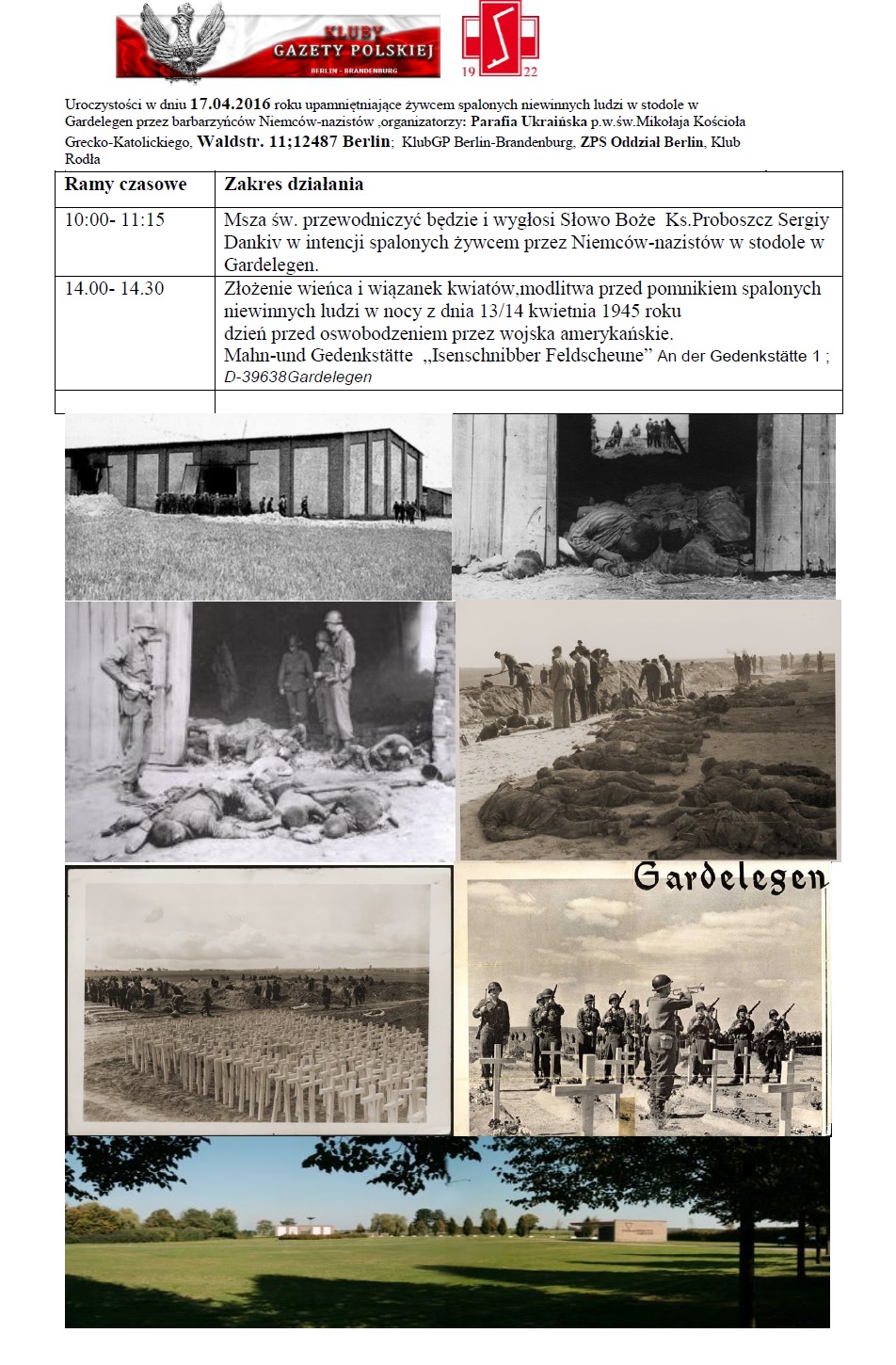 Związek Polskich Spadochroniarzy – Oddział Berlin oraz Parafia Ukraińska zamówiły Mszę świętą za ofiary tej zbrodni. Msza św.była celebrowana o godzinie 10:00, w dniu 17. kwietnia 2016 roku w w Parafii pw. św. Mikołaja, Ukraińskiego Kościoła Greckokatolickiego przy niemieckiej rzymskokatolickiej wspólnocie parafialnej św. Jana Ewangelisty w Berlinie, przez ks. proboszcza Sergiya Dankiva. Ksiądz proboszcz Sergiy wygłosił wzruszające kazanie i podziękował organizatorom .W Mszy św.oprócz wiernych uczestniczyła także, przybyła specjalnie na tę okazję, delegacja z Polski, z Klubu Rodła Ziemi Babimojskiej. Delegacja to potomkowie gnębionych, prześladowanych i mordowanych przez Niemców mieszkańców tego pięknego zakątka, który dopiero po II-giej wojnie światowej powrócił do Polski. Ksiądz Sergiy poświęcił trzy przepiękne wieńce, które przez cały czas trwania Mszy św.leżały przed ołtarzem. Po Mszy św. i krótkim spotkaniu przy kawie i smacznym cieście w salce parafialnej uczestnicy Eucharystii pojechali na cmentarz w Gardelegen gdzie po modlitwie złożono wieńce i zapalono znicze przy pomniku upamiętniającym to wydarzenie. Polakom i Ukraińcom nie są za bardzo znane tamte fakty.