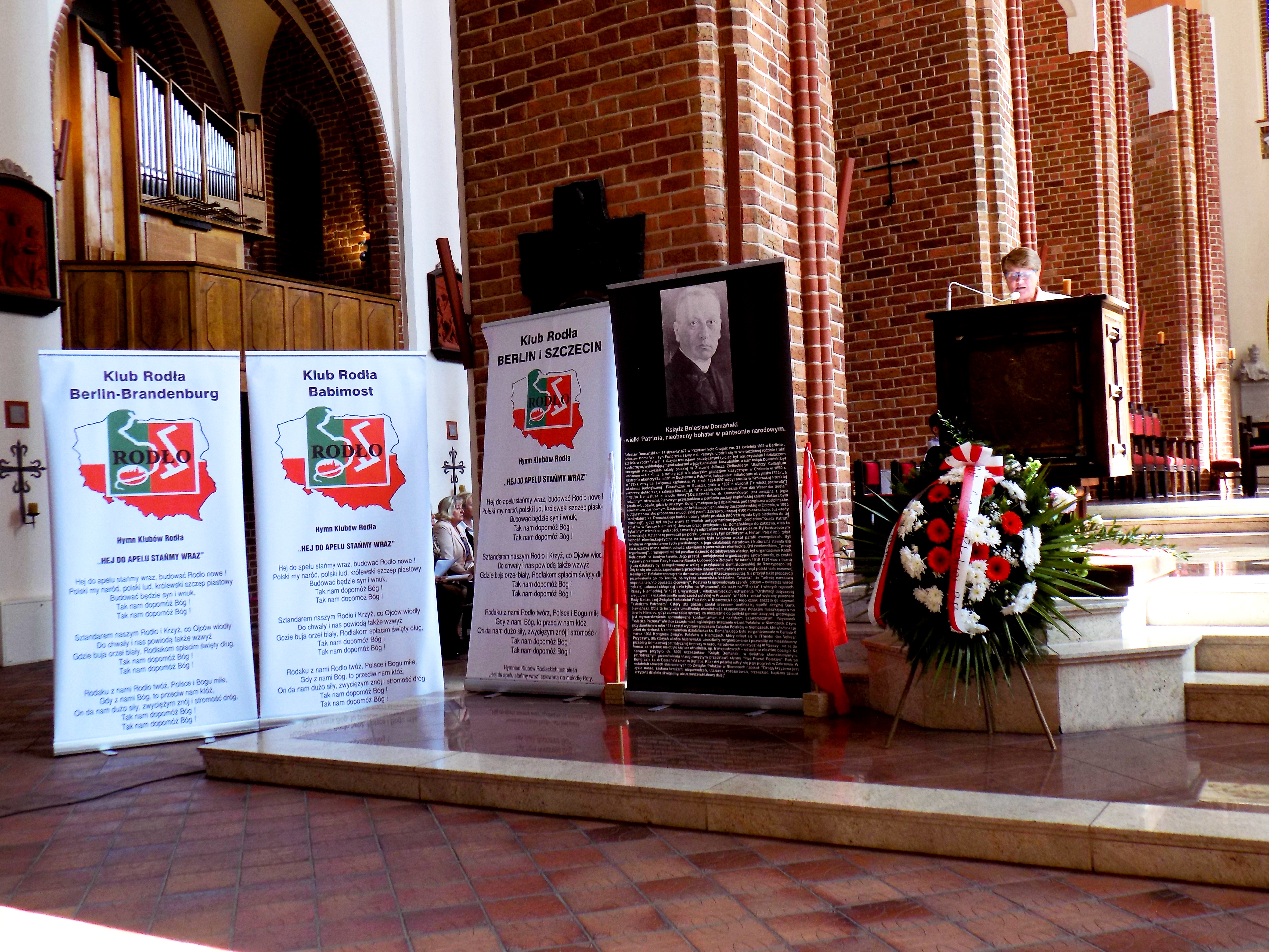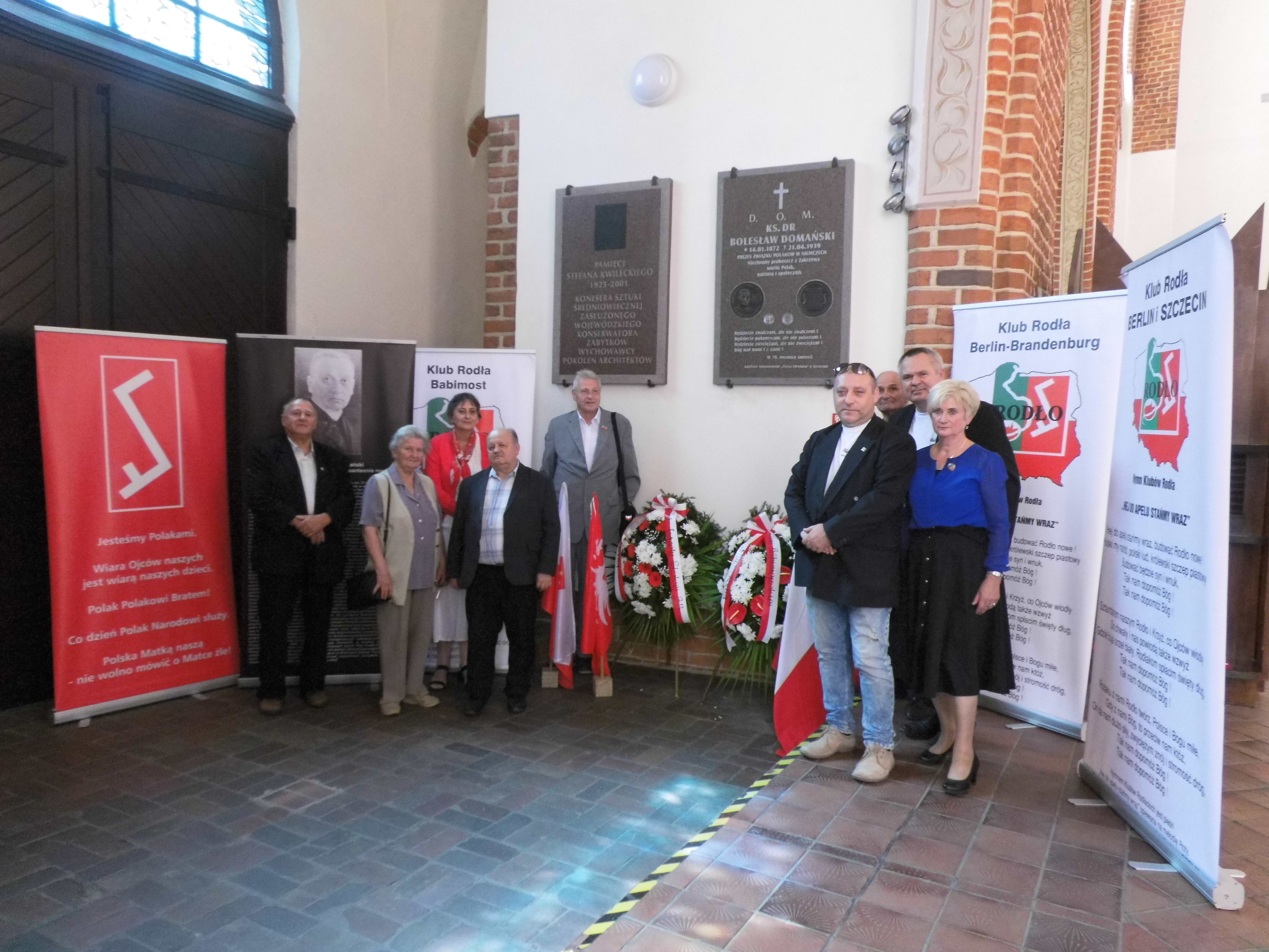 W dniu 26.08.18. w Szczecinie w wigilię 96.rocznicy powołania Związku Polaków w Niemczech – 27.08.1922, (Szczecin należał do byłej II dzielnicy Związku Polaków w Niemczech) odbyły się uroczystości obchodów założenia ZPwN, (rejestracja ZPwN na podstawie prawa pruskiego w Republice Weimarskiej 03.12.1922 rok) i zarazem uczczenia 80.rocznicy ogłoszenia Prawd Polaków na I Kongresie ZPwN w Berlinie( 6 marca 1938 roku),tej najstarszej i najbardziej zasłużonej dla Polski i Polaków na terenie Niemiec organizacji. Mszą św. w Katedrze o godz.12:00 celebrowaną w intencji wszystkich działaczy i sympatyków Rodła rozpoczęły się te podniosłe uroczystości. Eucharystię sprawował przewielebny ksiądz mgr Maciej Wagner z dwoma współbraćmi-księżmi, nowo powołany dekretem Jego Ekscelencji Księdza Arcybiskupa Prof. Dr Andrzeja Dzięgi wikariusz parafii pw. św. Jakuba Apostoła . W Mszy św. wzięli udział parafianie, przedstawiciele klubów Rodło Berlin-Brandenburg, Szczecin oraz delegacja Klubu Rodło Ziemi Babimojskiej z panem prezesem Stanisławem Fabisiem. Powitaniem zgromadzonych przed pomnikiem poświęconym „Ludziom Spod Znaku Rodła” w centrum Szczecina prezes Klubu Rodło Szczecin pan Andrzej Lindecki rozpoczął dalszą część obchodów. Następnie powitał wszystkich zebranych i przedstawił problemy i krótki rys historyczny Polaków w Niemczech prezes Klubu Rodło Berlin-Brandenburg podkreślając zasługi i heroizm członków ZPwN w walce o godność i zachowanie tradycji diaspory polskiej w Niemczech. Następnie złożyli wiązankę kwiatów obok stojących dwóch wieńców złożonych przez członków klubów Rodło i klubu Gazety Polskiej Berlin-Brandenburg w imieniu pana prezydenta Szczecina Piotra Krzystka ,pani Aleksandra Piasecka ,pełnomocnik prezydenta ds. współpracy międzynarodowej,gminy-miasta Szczecin oraz pan radny PiS Janusz Jagielski,. Po złożeniu wiązanki, zgromadzeni odśpiewali hymn-Mazurka Dąbrowskiego zaintonowany przez członkinię Klubu Rodło Szczecin. W uroczystościach pod pomnikiem-obeliskiem wzięli udział mieszkańcy Szczecina i przedstawiciele Klubu Rodło Berlin-Brandenburg, Szczecin i Ziemi Babimojskiej. Po uroczystym złożeniu wieńców i wiązanki kwiatów przez delegacje przed obeliskiem ,zgromadzeni udali się do pięknej restauracji mieszczącej się w odnowionej villi Sorrento.na smaczny obiad.