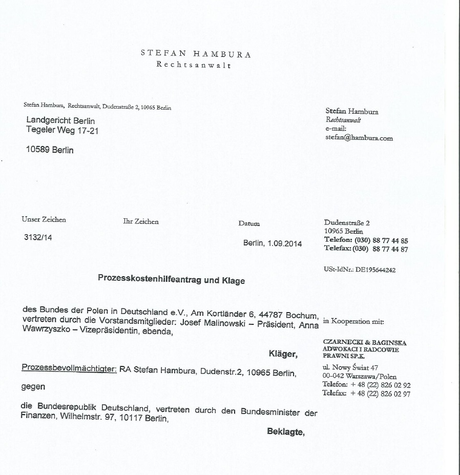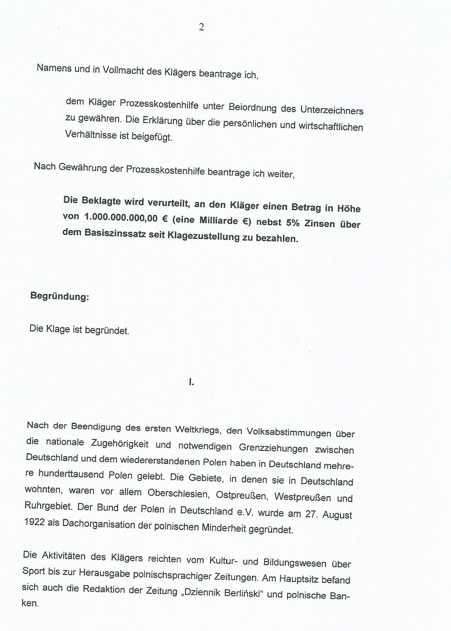 Związek Polaków w Niemczech złożył w niemieckim sądzie pozew, w którym domaga się od Niemiec ogromnego odszkodowania. Mecenas Stefan Hambura, który reprezentuje Związek, poinformował w rozmowie z portalem niezalezna.pl, że chodzi o 1 miliard euro.