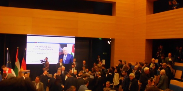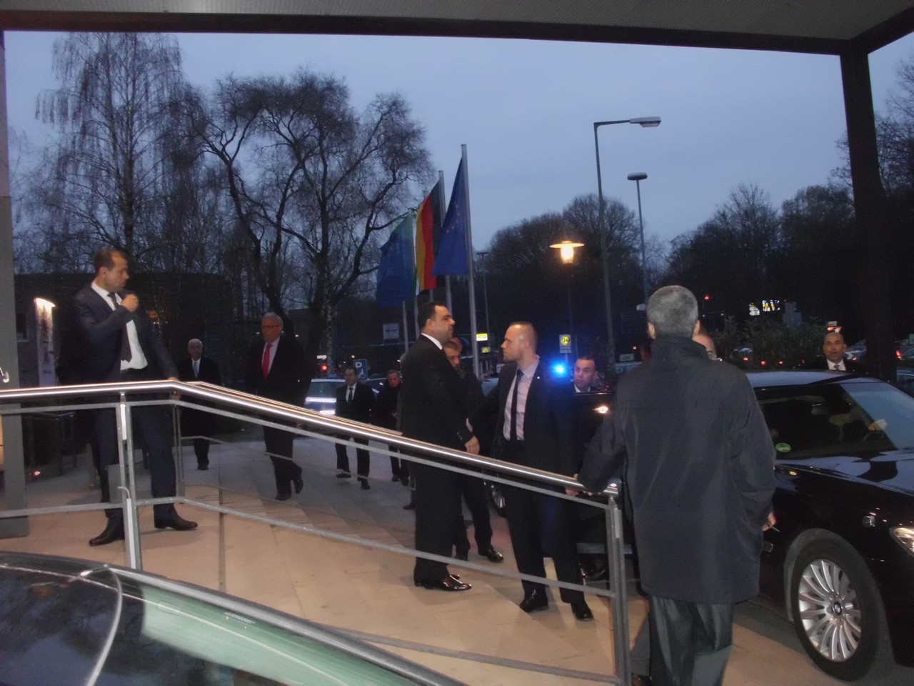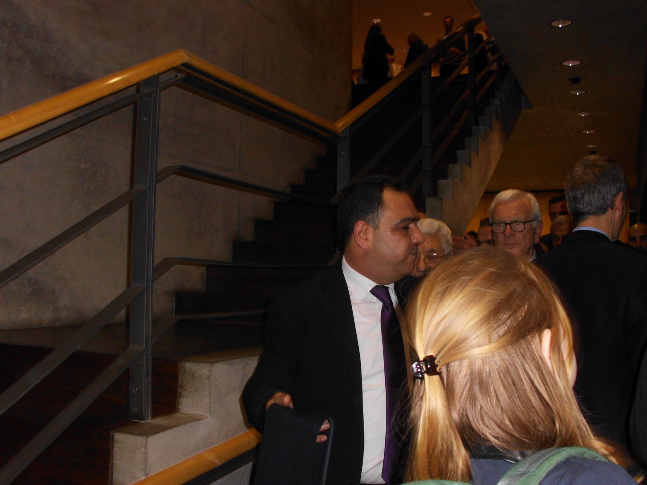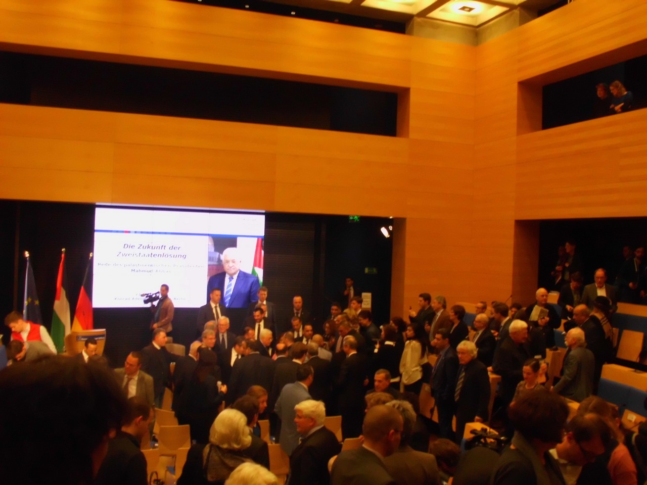 Czekaliśmy w grupie osób na przyjazd Pana Prezydenta Autonomii Palestyńskiej. Jak wysiadł Pan Mahmud Abbas z limuzyny, zbliżyli się do naszej grupy, młodzi ludzie zapewne Palestyńczycy, zaczęły się krzyki i wrzaski, podnieśli do góry plakaty z wizerunkami młodych ludzi, wyglądało to groźnie. Policja szybko interweniowała i oddzieliła ich od nas. Także z sali wyprowadzono kilka osób, zanim rozpoczęło się spotkanie. Po spotkaniu Pan Prezydent przywitał się w obecności pana H.Potteringa.
