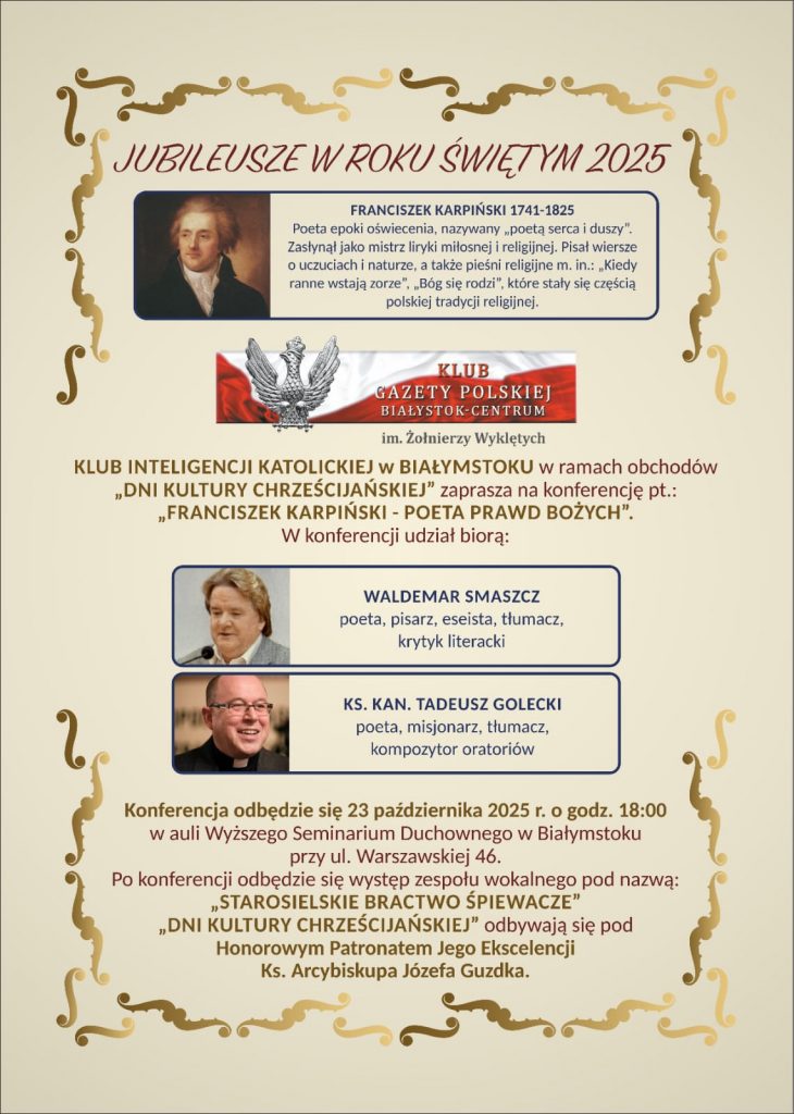 Klub „Gazety Polskiej” Białystok Centrum oraz KiK w Białymstoku zapraszają na konferencję pt. ” Franciszek Karpiński Poeta Prawd Bożych” z udziałem Waldemara Smaszcza oraz ks. kan. Tadeusza Goleckiego