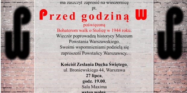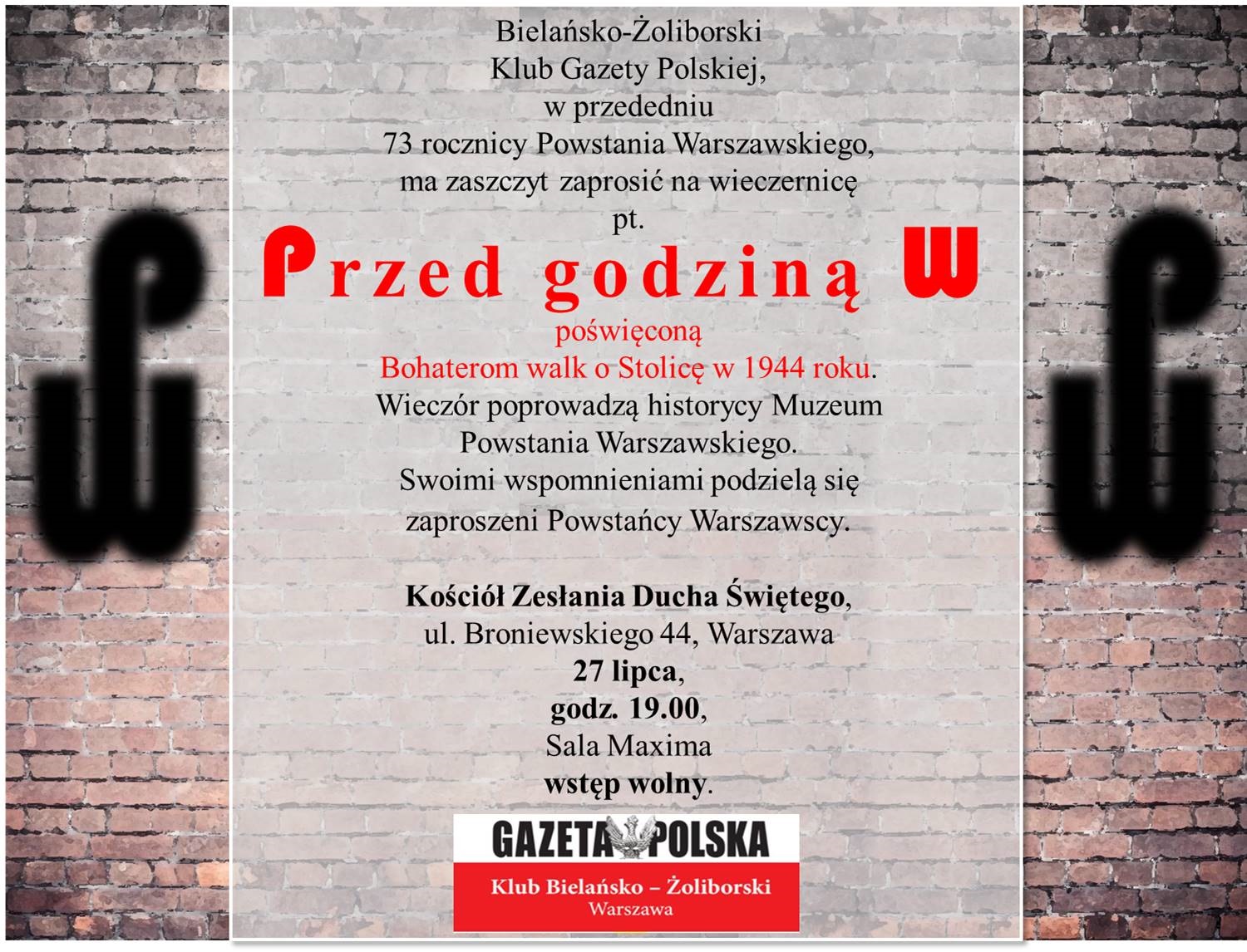 Bielańsko-Żoliborski Klub „GP” w Warszawie w przededniu 73. Rocznicy Powstania Warszawskiego, ma zaszczyt zaprosić na wieczernicę pt. ”Przed godziną W” poświęconą Bohaterom walk o Stolicę w 1944 roku. Wieczór poprowadzą historycy Muzeum Powstania Warszawskiego. Swoimi wspomnieniami podzielą się zaproszeni Powstańcy Warszawscy.