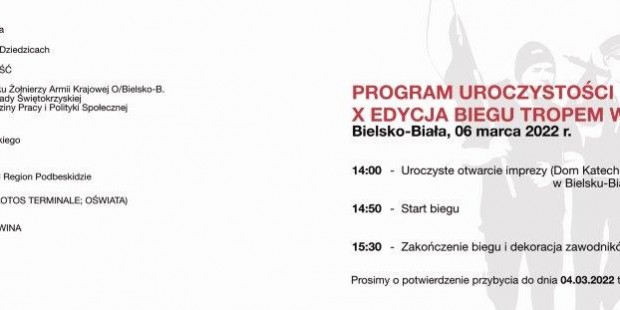 BIELSKO-BIAŁA | ZAPROSZENIE X edycja Tropem Wilczym – Biegu Pamięci Żołnierzy Wyklętych. 6 marca W niedzielę, 6 marca w Bielsku-Białej odbędzie się X edycja Tropem Wilczym – Biegu Pamięci Żołnierzy Wyklętych. mar 4, 2022 Kluby GP Bielsko Biała, KlubyGP Tagged bieg Tropem Wilczym, Bielsko Biała Wstecz CZECHOWICE-DZIEDZICE | ZAPROSZENIE X edycja Tropem Wilczym – Biegu Pamięci Żołnierzy Wyklętych. 6 marca Dalej WARSZAWA | Spotkanie z Ministrem Przemysławem Czarnkiem