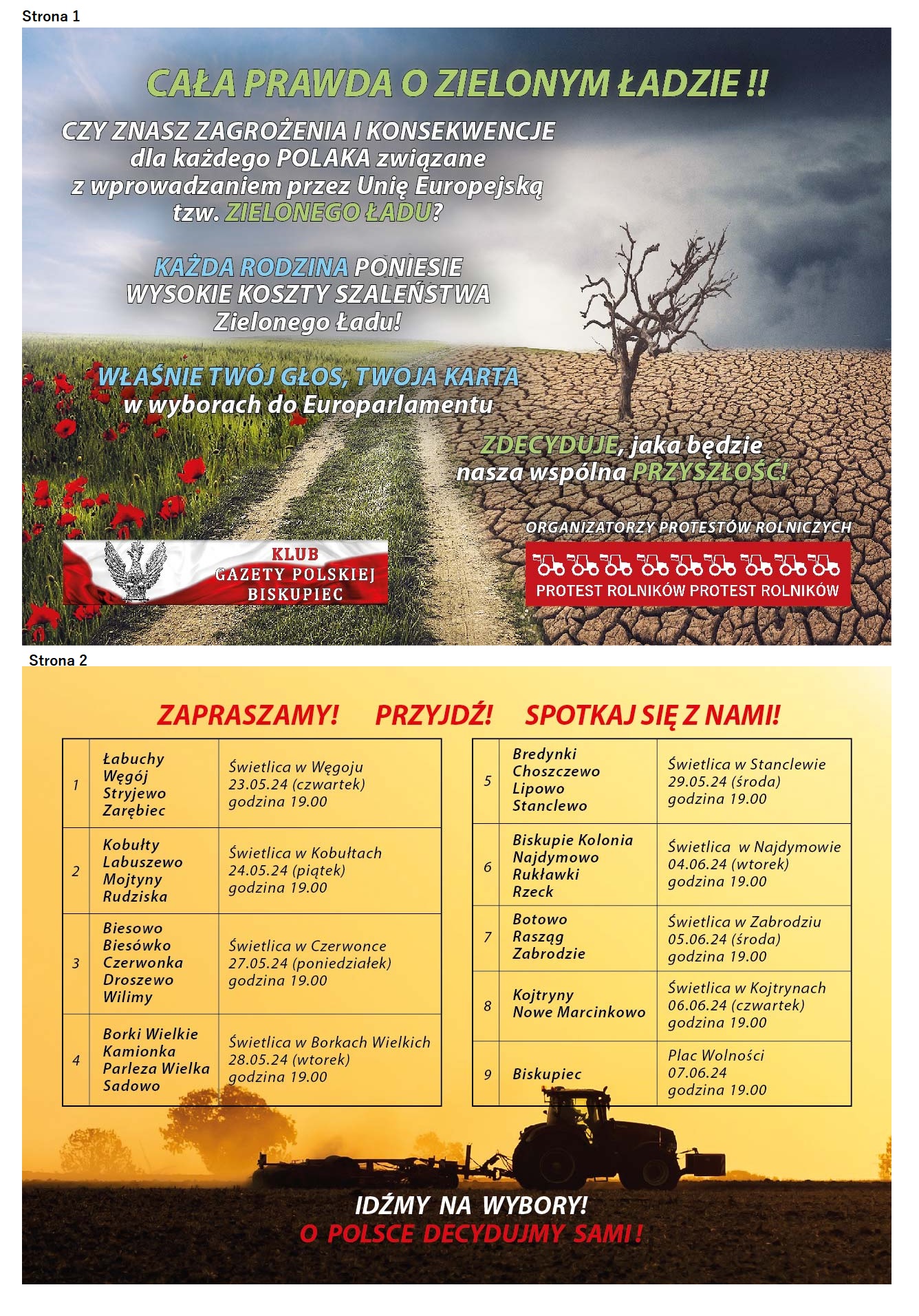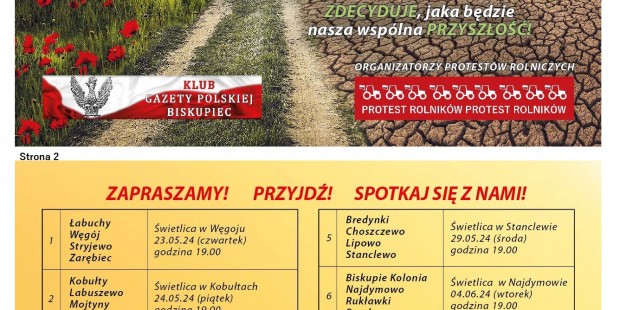 BISKUPIEC | ZAPROSZENIE 23.05 – 7.06 spotkania przed eurowyborami. Cała prawda o Zielonym Ładzie Cała prawda o Zielonym Ładzie! Klub Gazety Polskiej Biskupiec zaprasza na spotkania przedwyborcze na których poruszane będą tematy dotyczące zagrożenia i konsekwencji wprowadzenia zielnego ładu. Terminy i szczegóły na ulotce poniżej. maj 20, 2024 Kluby GP Biskupiec, KlubyGP, Wiadomosci Tagged Biskupiec, Kluby GP Wstecz WRZEŚNIA | ZAPROSZENIE 27.05 – Spotkanie z T.Sakiewcz, P. Lisiewicz, M. Maląg, Z. Dolata Dalej OLSZTYN | ZAPROSZENIE 25.05 – Uroczyste Obchody męczeńskiej śmierci Rotmistrza Witolda Pileckiego