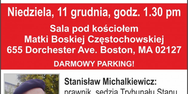 Boston (USA) – spotkanie ze Stanisławem Michalkiewicze nt.”Sytuacja polityczna Polski po wyborach w USA”, 11 grudnia Boston (USA) – spotkanie ze Stanisławem Michalkiewicze nt.”Sytuacja polityczna Polski po wyborach w USA”, 11 grudnia, g. 1.30 PM, sala pod Kościołem Matko Boskiej Częstochowskiej 655 Dorchester Ave. Boston, MA 02127. gru 7, 2016 Kluby GP Boston (USA) Tagged Boston (USA), Stanisław Michalkiewicz Wstecz Rdzawka – miesięcznica tragedii smoleńskiej, 10 grudnia Dalej Boston (USA) – uroczysta Msze Św. w intencji ofiar stanu wojennego, 13 grudnia, g. 19