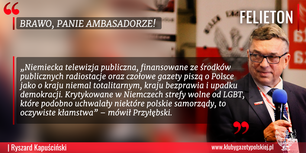 Szok, prowokacyjne wystąpienie, skandal dyplomatyczny, ambasador zrobił awanturę – tak niemieckie i polskojęzyczne media komentowały wystąpienie ambasadora RP w Berlinie Andrzeja Przyłębskiego podczas uroczystej sesji parlamentu Brandenburgii z okazji 30-lecia Traktatu Polsko-Niemieckiego. Cóż takiego powiedział Przyłębski, że np. „Der Tagesspiegel” zarzucił mu krytykę niemieckich mediów za kreowanie negatywnego wizerunku Polski? Powiedział prawdę: „Niemiecka telewizja publiczna, finansowane ze środków publicznych radiostacje oraz czołowe gazety piszą o Polsce jako o kraju niemal totalitarnym, kraju bezprawia i upadku demokracji. Krytykowane w Niemczech strefy wolne od LGBT, które podobno uchwalały niektóre polskie samorządy, to oczywiste kłamstwa” – mówił Przyłębski. Przypomniał, że Polska finansuje naukę języka niemieckiego niewielkiej grupy dolnośląskich Niemców za 50 mln euro rocznie, a bogate Niemcy nie są w stanie zasilić szkolnictwa polonijnego zaproponowaną dopiero w bieżącym roku kwotą 5 mln euro. – To, z czym naprawdę mamy w Polsce do czynienia, to swego rodzaju „zdrada elit”, w tym „rokosz” sędziów, którzy porzucili ideały swego zawodu – mówił ambasador. A może prawda ich wyzwoli?