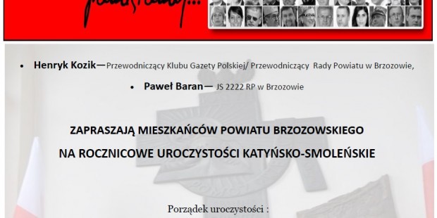 Zapraszają mieszkańców powiatu brzozowskiego 09 kwietnia 2017 r. na godz. 12:15 do Kościoła pw. Przemienienia Pańskiego w Brzozowie na rocznicowe uroczystości Katyńsko-Smoleńskie