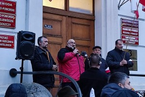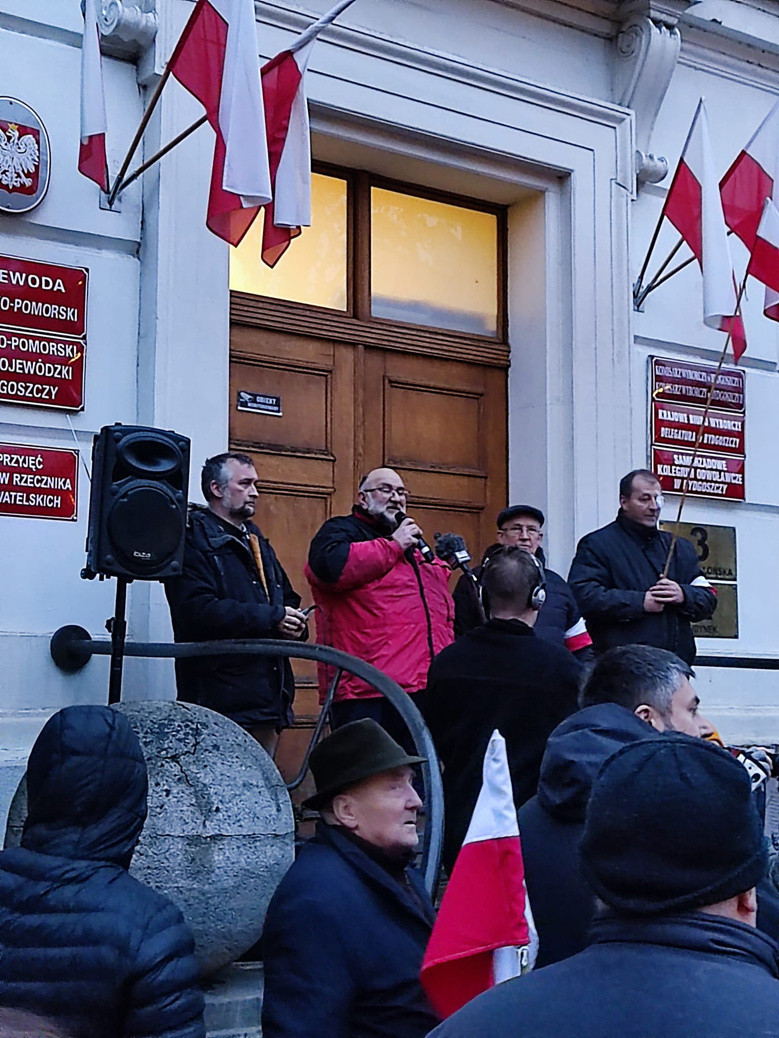 Jako pierwszy głos zabrał przewodniczący bydgoskiego klubu „Gazety Polskiej” Krystian Frelichowski: Jesteśmy tutaj, by bronić naszych praw, każdego nas prawa do dostępu do informacji, z różnych źródeł, byśmy sami mogli wybierać, jakich dziennikarzy słuchamy, a nie żeby nam z góry narzucano jedyną słuszną prawdę – mówi Krystian Frelichowski, radny miasta Bydgoszczy z PiS, współorganizator protestu. – Jesteśmy też tutaj, by bronić więźniów politycznych, przypomnę, że ułaskawienie obecnie osadzonych było sprawdzane przez Trybunał Konstytucyjny, który uznał, kilka lat temu, że jest to prawidłowe – dodaje. Skoro przyszli po nich, mogą przyjść po każdego z nas…
