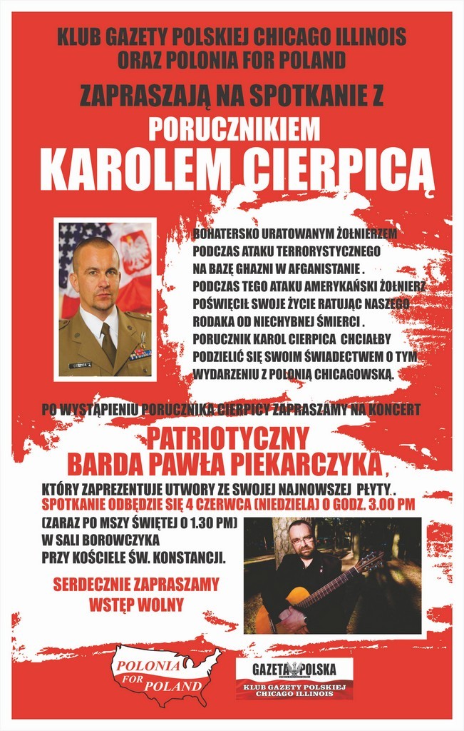 W niedzielę, 4 czerwca, gościliśmy w Chicago Por. Karola Cierpicę oraz znanego w Polsce i w Ameryce Barda Pawła Piekarczyka. Spotkanie miało miejsce w sali Borowczyka przy Kościele św. Konstancji  i było, wg wielu uczestników, jednym z najciekawszych spotkań polonijnych ostatnich lat. W pierwszej części zebrani obejrzeli krótkie filmy oraz wysłuchali wzruszających wspomnień Por. Karola Cierpicy z wydarzeń związanych z atakiem terrorystycznym w Afganistanie, w czasie którego życie straciło wielu żołnierzy polskich i amerykańskich. Por. Karol Cierpica został ranny i trafił do szpitala, a młody żołnierz amerykański, Michael Ollis, osłaniając go swoim ciałem, sam  stracił życie. To wydarzenie całkowicie odmieniło Karola Cierpicę.