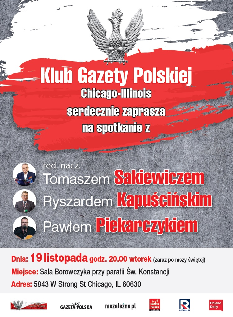 Chicago-Illinois – spotkanie z red. nacz. Tomaszem Sakiewiczem, Ryszardem Kapuścińskim, Pawłem Piekarczykiem, 19 listopada, g. 20, zaraz po Mszy św. Sala Borowczyka przy parafii Św. Konstancji, 5843 W Strong St Chicago, IL 60630.