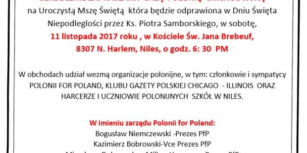 Chicago-Illinois – uroczyste obchody Narodowego Święta Niepodległości, 11 listopada, g. 18.30 Msza św. w Kościele św. Jana Brebeuf 8307N. Harlem, Niles.