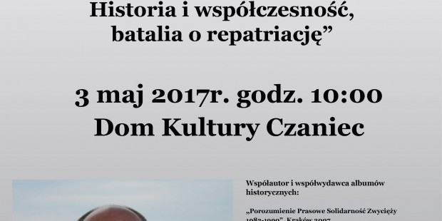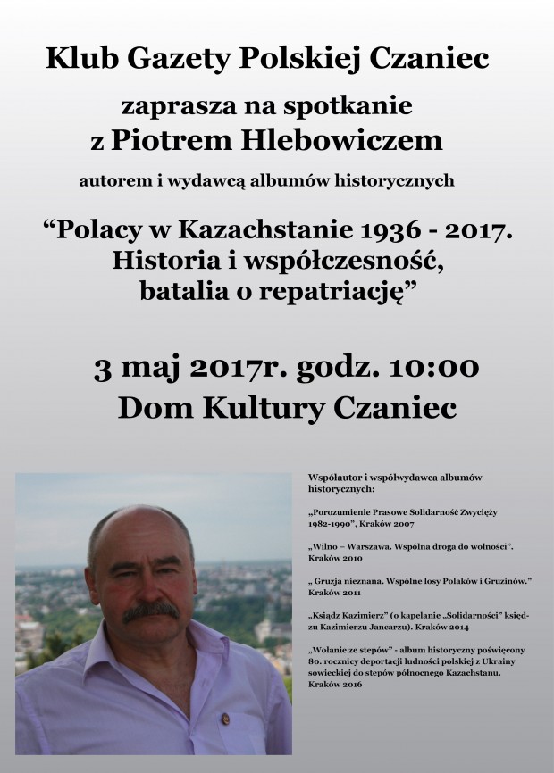 Czaniec – spotkanie z Piotrem Hlebowicz, 3 maja Czaniec – spotkanie z Piotrem Hlebowicz, 3 maja, g. 10, w Domu Kultury Czaniec. Temat spotkania: Polacy w Kazachstanie 1936-2017 Historia i współczesność, batalia o repatriacje. kw. 6, 2017 Kluby GP Czaniec Tagged Czaniec Wstecz Minęło już 7 lat! Dalej Dzieci i młodzież z Kresów Wschodnich…..