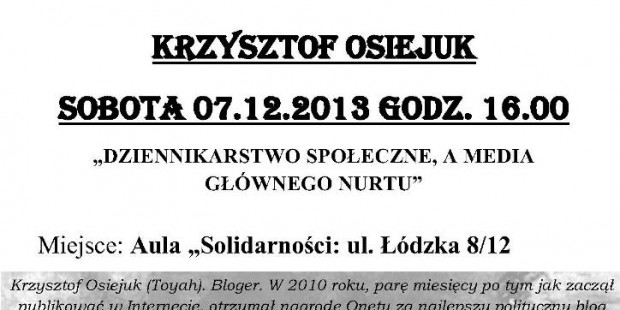 Częstochowa – spotkanie z Krzysztofem Osiejukiem pt. „Dziennikarstwo społeczne, a media głównego nurtu”, 7 grudnia, g. 16 Częstochowa – spotkanie z Krzysztofem Osiejukiem pt. „Dziennikarstwo społeczne, a media głównego nurtu”, 7 grudnia, g. 16, Aula „Solidarności” ul. Łódzka 8/12. gru 2, 2013 Kluby GP Częstochowa Tagged Częstochowa, Krzysztof Osiejuk Wstecz Zjazd Klubów „Gazety Polskiej” z regionu Pomorza. Dalej Myślenice – spotkanie ze Sławomirem Kmiecikiem, 5 grudnia, g. 19