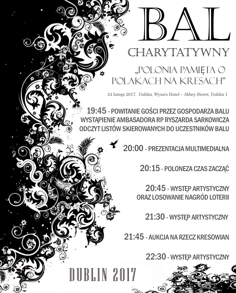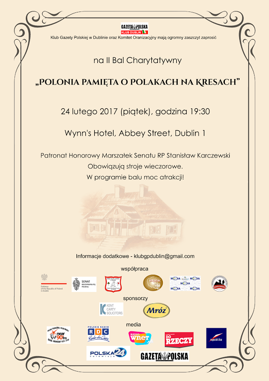 II Bal Charytatywny „Polonia pamięta o Polakach na Kresach”, 24 lutego 19:30, Wynn’s Hotel, Abbey Street, Dublin 1. Patronat Honorowy Marszałek Senatu RP Stanisław Karczewski. Informacje: klubgpdublin@gamil.com