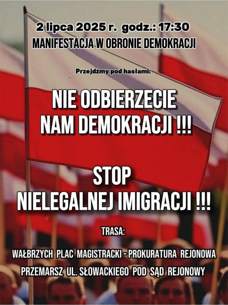 – 2 lipca w Wałbrzychu odbyła się manifestacja przeciwko nielegalnej imigracji i przyzwalaniu przez rząd Donald Tusk na przywożenie do Polski migrantów przez niemiecką policję, a także przeciwko niszczeniu demokracji i instytucji państwa polskiego przez Koalicję 13 grudnia.