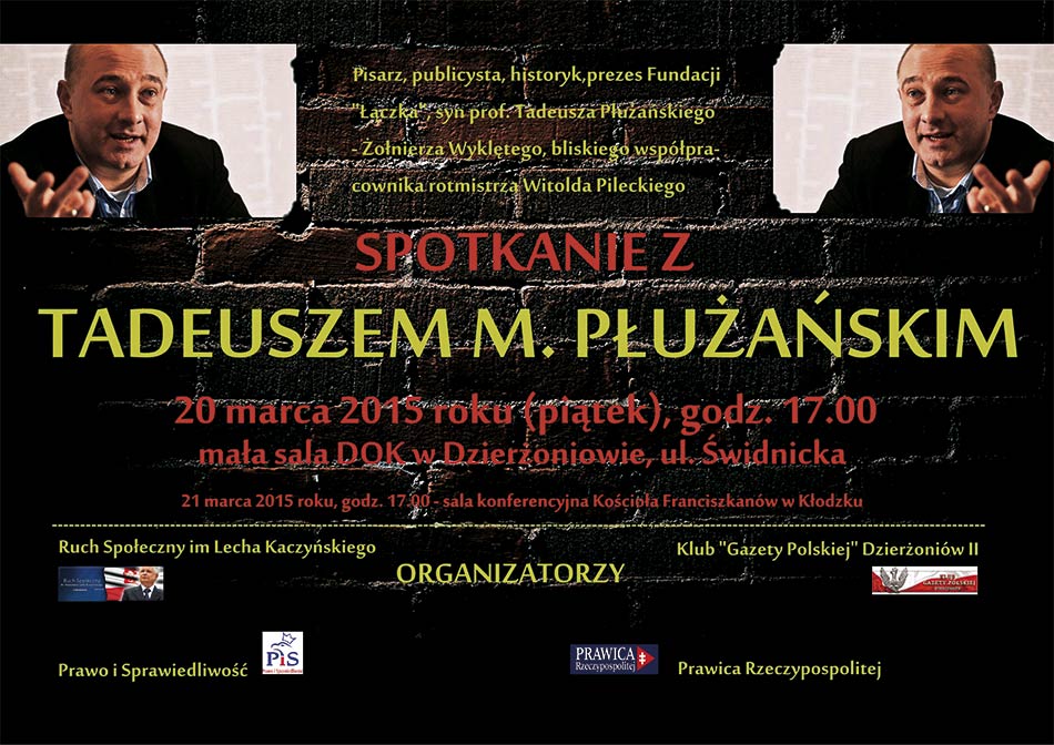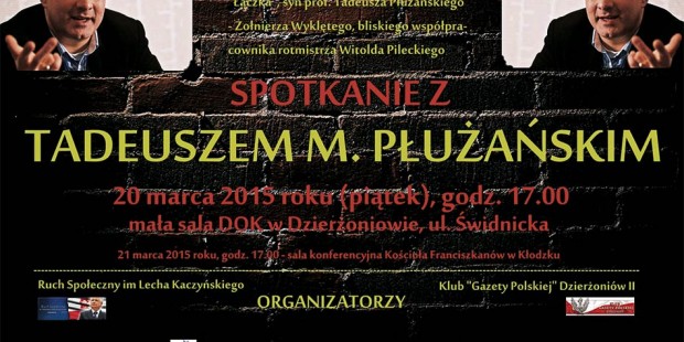 Klub „Gazety Polskiej” Dzierżoniów II zaprasza na spotkanie z Tadeuszem Płużańskim, pisarzem, publicystą, historykiem, prezesem Fundacji Łączka, synem prof. Tadeusza Płużańskiego – Żołnierza Wyklętego, bliskiego współpracownika rotmistrza Witolda Pileckiego – 20 marca, g. 17, mała sala DOK, ul. Świdnicka.