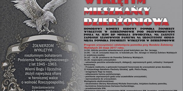 Honorowy komitet budowy pomnika żołnierzy wyklętych w Dzierżoniowie pod przewodnictwem posła na sejm RP Michała Dworczyka, ma zaszczyt zaprosić na 20.05.2017 roku o godz. 15.00. Szanownych Państwa na uroczystość odsłonięcia pomnika żołnierzy wyklętych.
