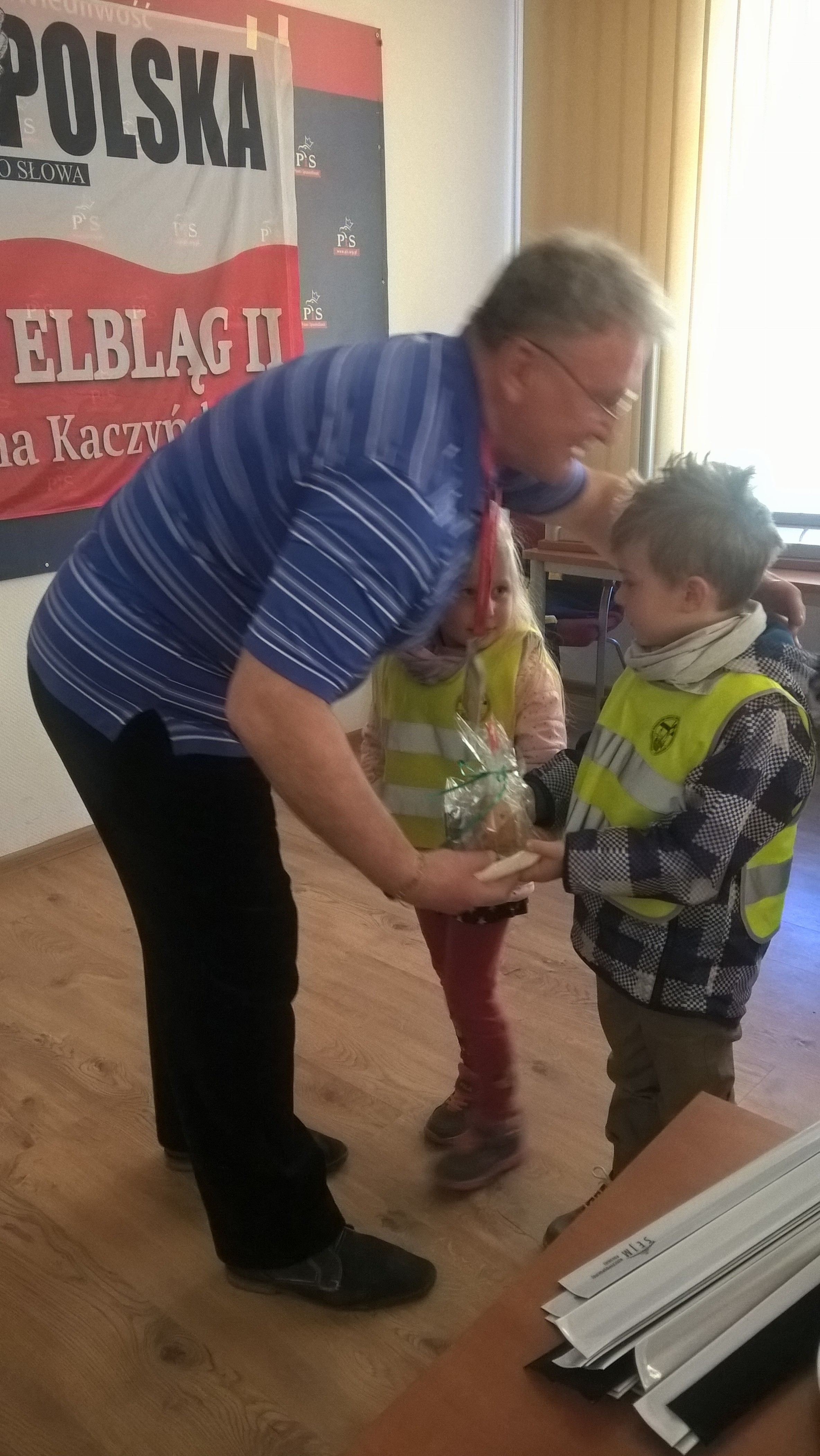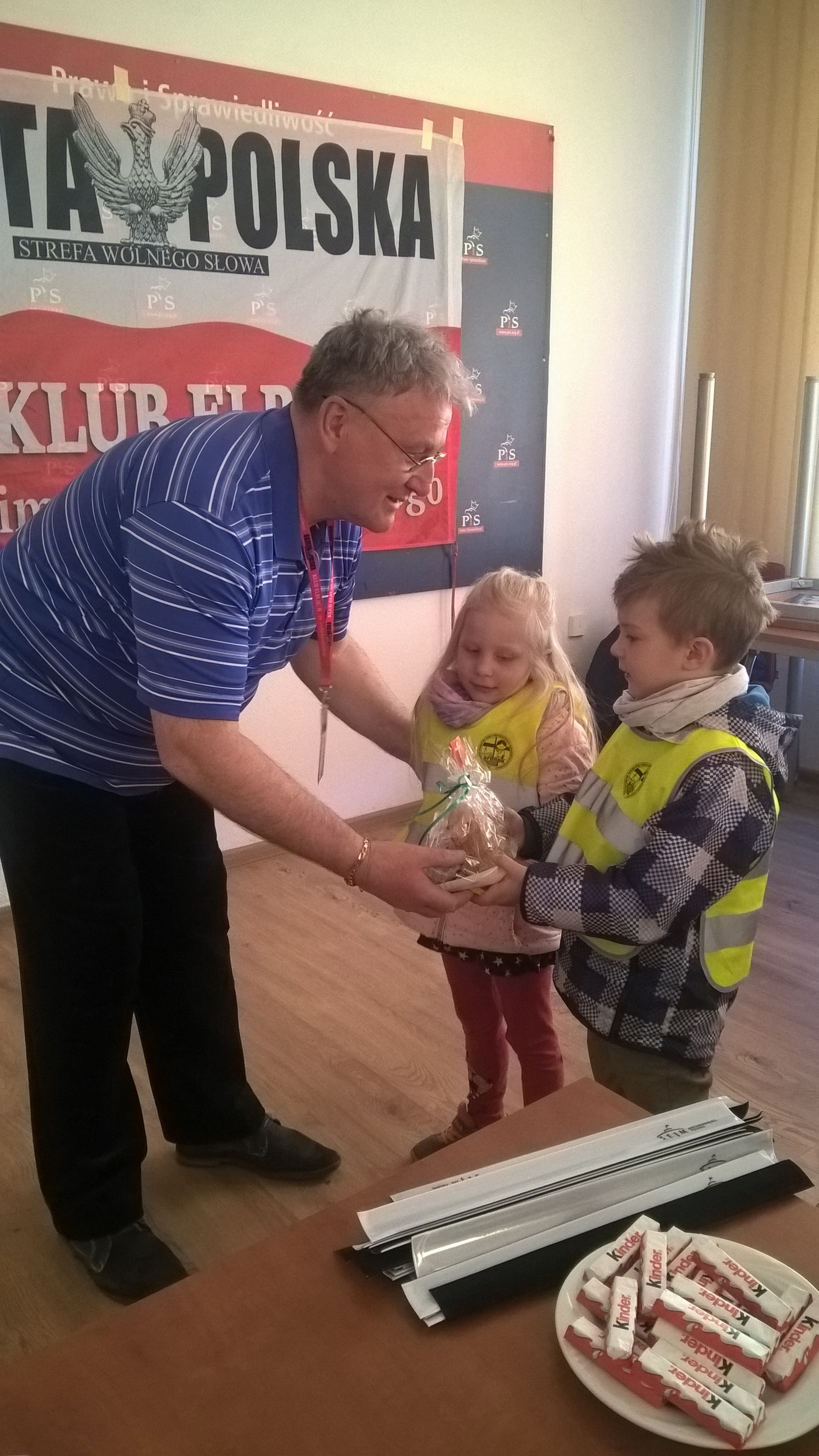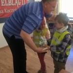 Dzieci wręczyły nam Baranka Bożego – symbol Naszego Pana JEZUSA CHRYSTUSA. My wraz z Ireneuszem wręczyliśmy dzieciom zajączki świąteczne. Każde dziecko dostało po dwa baranki, jeden dla siebie i drugi dla rodziny. Wręczyliśmy również odblaski na rękę