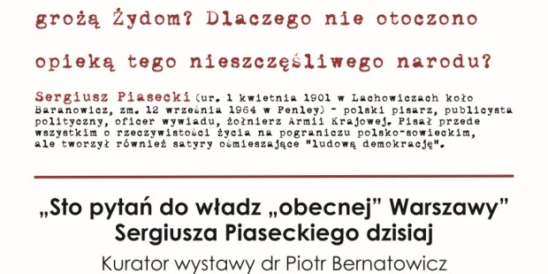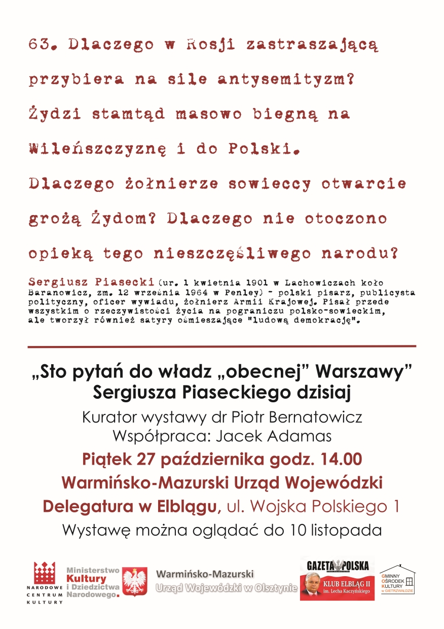 Klub Gazety Polskiej Elbląg II im Lecha Kaczyńskiego jako współorganizator zaprasza na dzień 27 października do Urzędu Wojewódzkiego w Elblągu przy ulicy Wojska Polskiego na godz. 14 na inaugurację wystawy poświęconej pisarzowi, żołnierzowi AK Sergiuszowi Piaseckiemu.