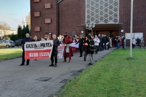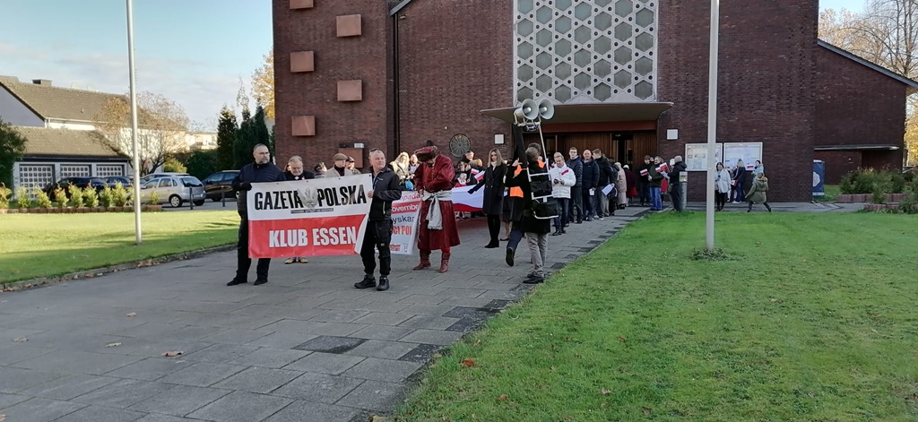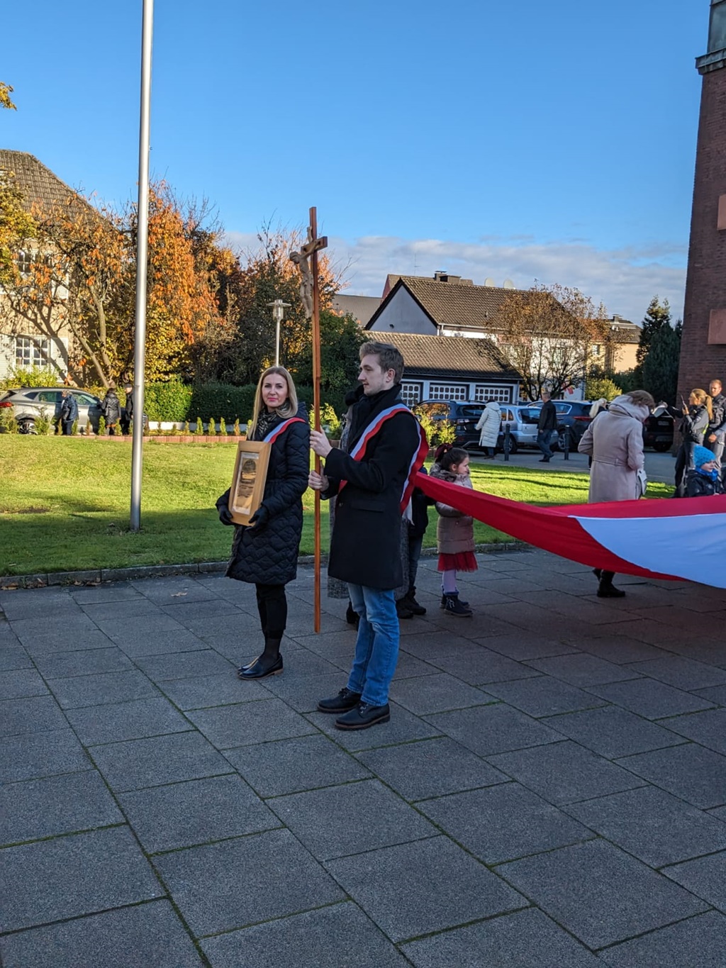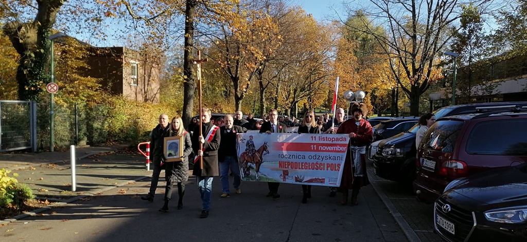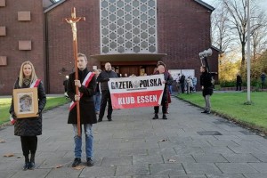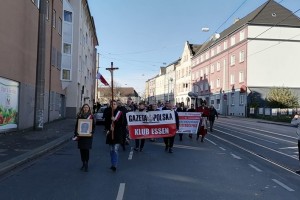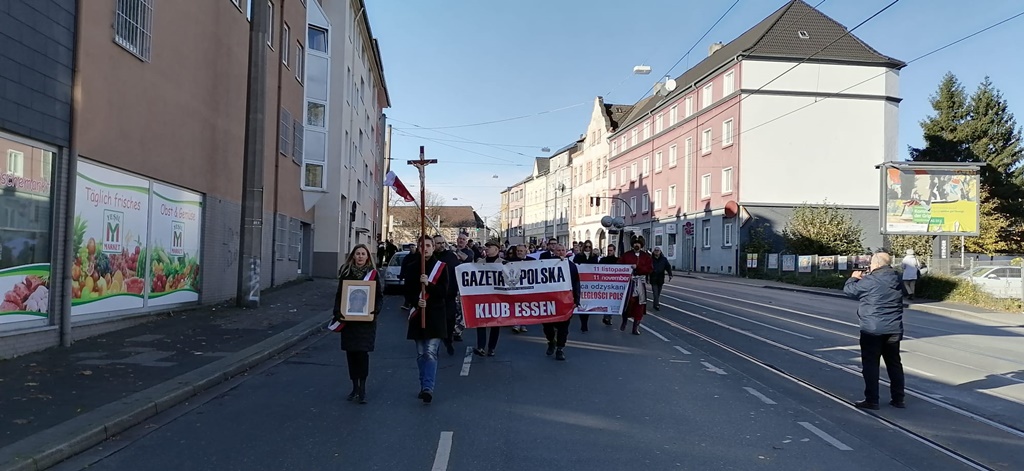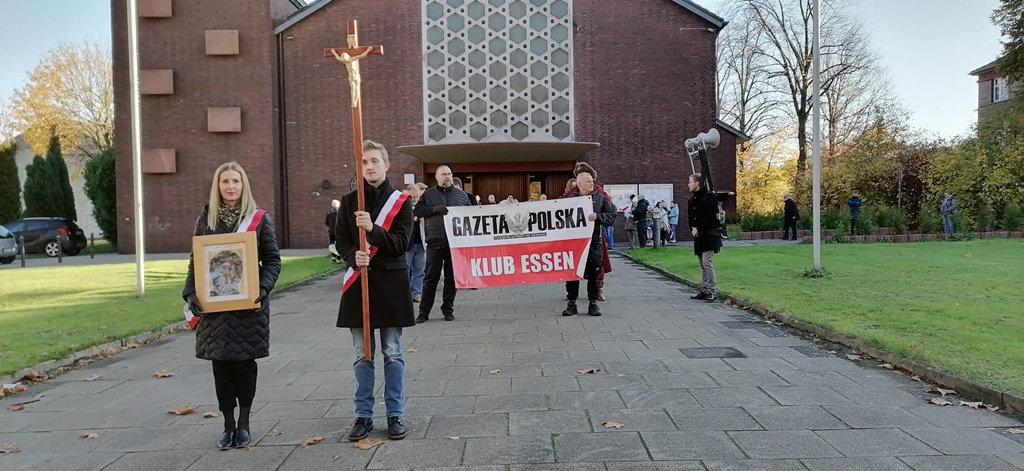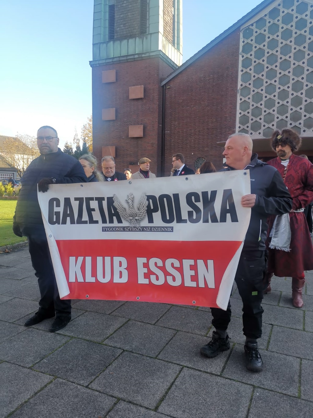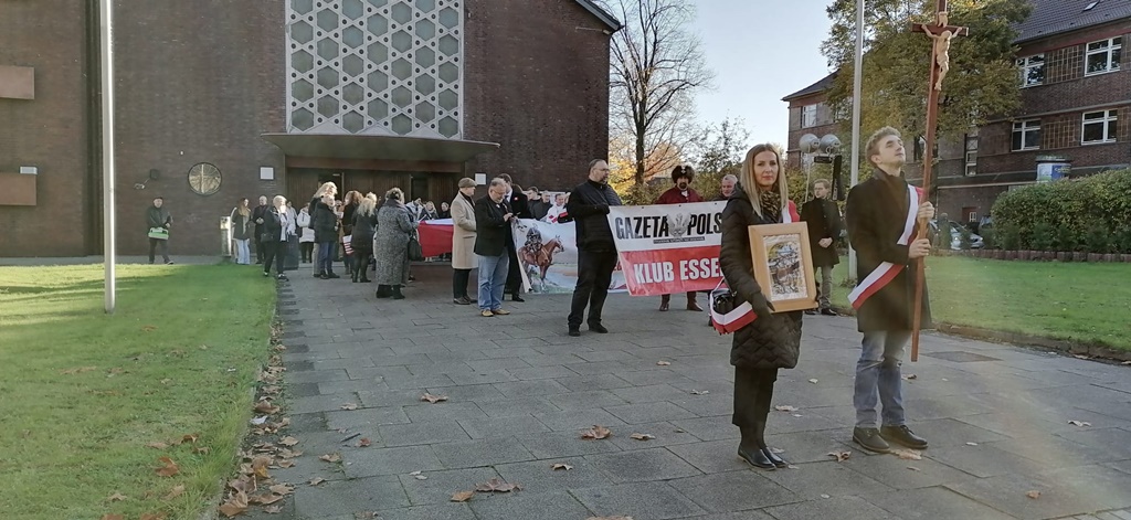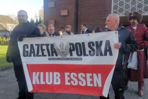 Niedzielę 12. listopada rozpoczęliśmy uroczystą Mszą świętą, którą koncelebrowali posługujący w Essen Księża Chrystusowcy tj. ks. Jerzy Wieczorek SChr i Sławomir Pelec SChr. Podczas tej niedzielnej liturgii ks. proboszcz Wieczorek powitał przybyłych oficjeli w tym Konsula ds. Polonii Jana Krzymowskiego, Wojciecha Poczachowskiego z Instytut Polskiego w Düsseldorfie, naszych prelegentów Pawła Piekarczyka i dr Jacka Pawłowicza. Proboszcz wspomniał o wspólnej inicjatywie Polskiej Parafii, Klubu Gazety Polskiej i Polskiej Listy Wyborczej „POLACY w ESSEN” jako o organizatorach tych obchodów. Podczas liturgii były wyraźnie słyszalne akcenty patriotyczne stosowne do tych obchodów, a ks. S. Pelec SChr w swej homilii rozwinął myśl ewangeliczną, nawiązując do postawy roztropnych panien. Pod koniec Mszy świętej ks. Proboszcz przekazał naszym reprezentantom Wiliamowi Sadowskiemu i Monice Brzezinski krzyż pielgrzymkowy i obraz Matki Boskiej Częstochowskiej. Wraz z zakończeniem Mszy świętej i ich wyjściem z kościoła począł się formować nasz dwunasty Marsz Niepodległości w Essen. U czoła Marszu niesiony krzyż i obraz MB Częstochowskiej, dalej oficjele z naszymi banerami i tłum Polaków zamieszkałych w Essen i okolicach, to obraz rozśpiewanego esseńskiego Marszu Niepodległości, inicjatywy wyjątkowej na ziemi niemieckiej.