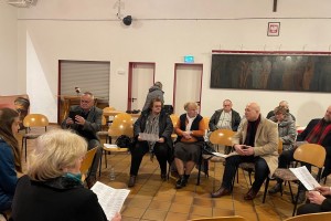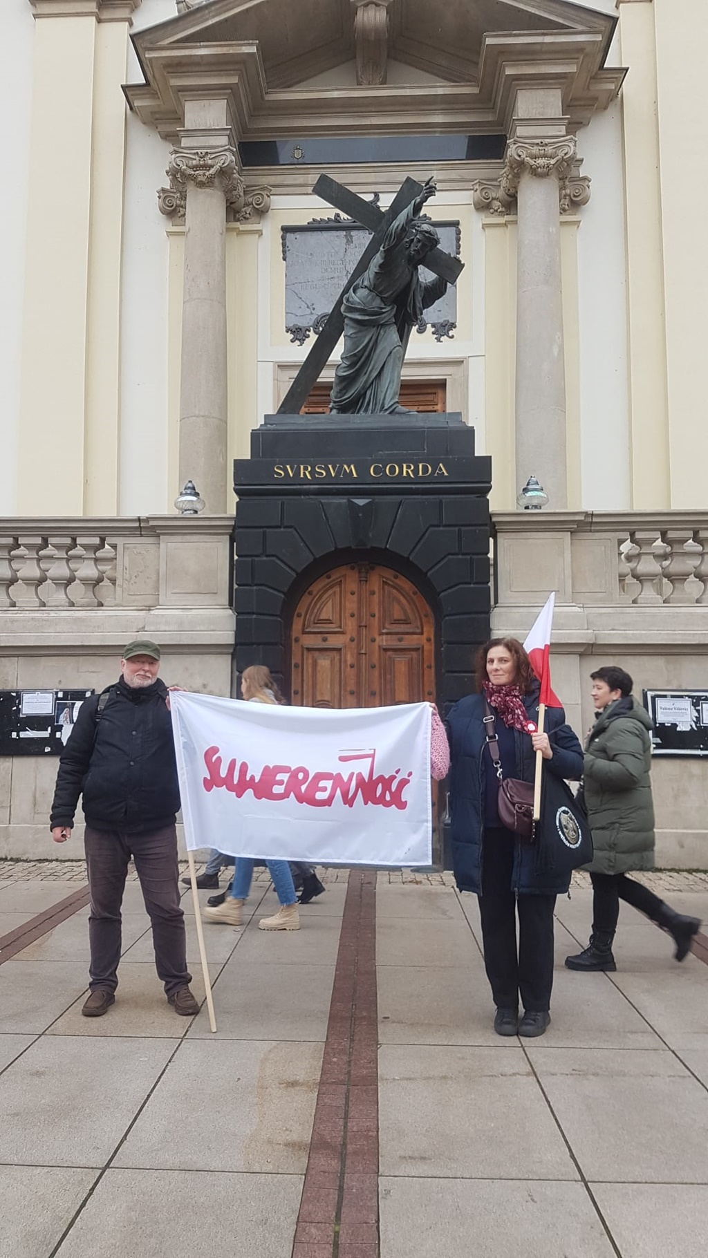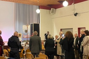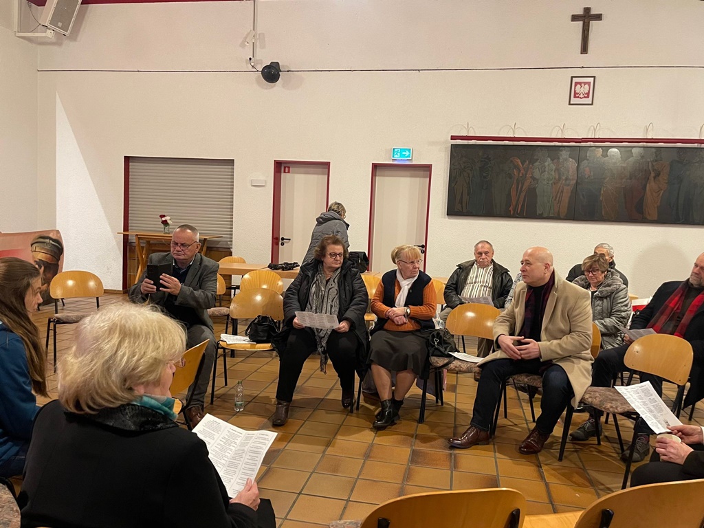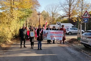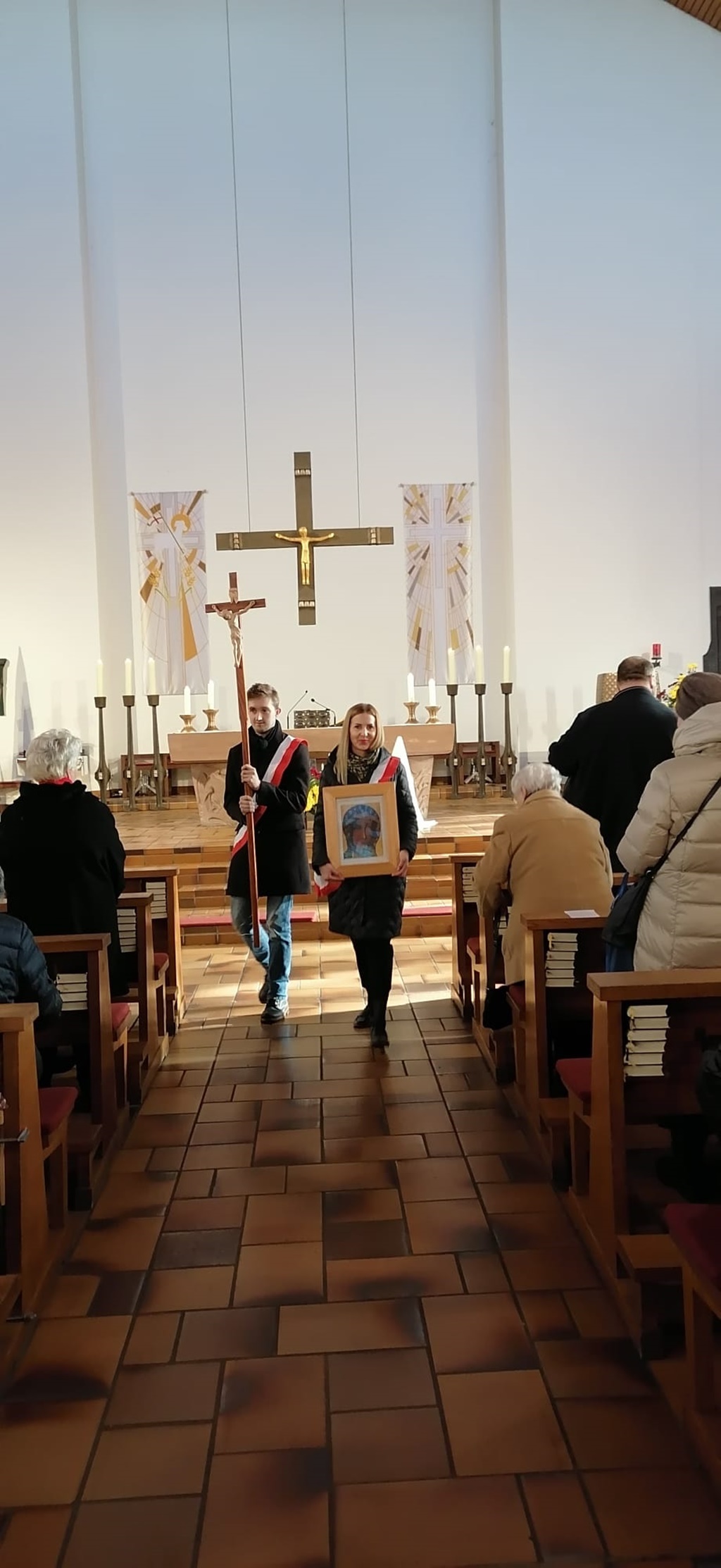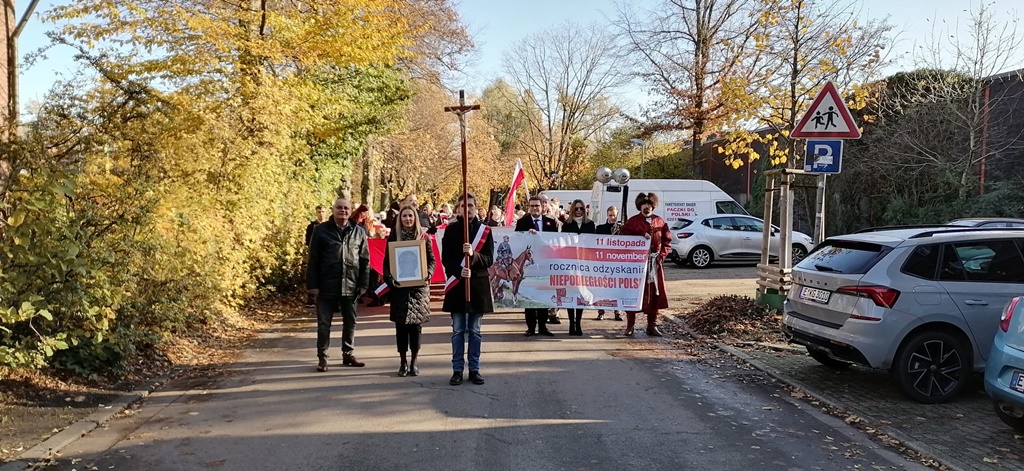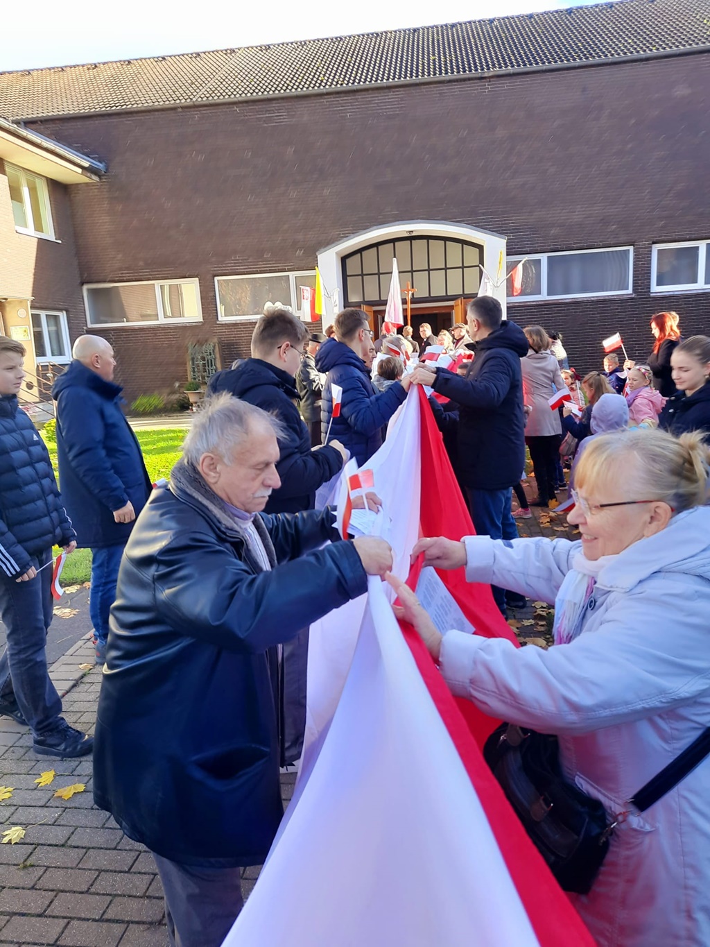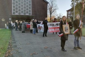 Niedzielę 12. listopada rozpoczęliśmy uroczystą Mszą świętą, którą koncelebrowali posługujący w Essen Księża Chrystusowcy tj. ks. Jerzy Wieczorek SChr i Sławomir Pelec SChr. Podczas tej niedzielnej liturgii ks. proboszcz Wieczorek powitał przybyłych oficjeli w tym Konsula ds. Polonii Jana Krzymowskiego, Wojciecha Poczachowskiego z Instytut Polskiego w Düsseldorfie, naszych prelegentów Pawła Piekarczyka i dr Jacka Pawłowicza. Proboszcz wspomniał o wspólnej inicjatywie Polskiej Parafii, Klubu Gazety Polskiej i Polskiej Listy Wyborczej „POLACY w ESSEN” jako o organizatorach tych obchodów. Podczas liturgii były wyraźnie słyszalne akcenty patriotyczne stosowne do tych obchodów, a ks. S. Pelec SChr w swej homilii rozwinął myśl ewangeliczną, nawiązując do postawy roztropnych panien. Pod koniec Mszy świętej ks. Proboszcz przekazał naszym reprezentantom Wiliamowi Sadowskiemu i Monice Brzezinski krzyż pielgrzymkowy i obraz Matki Boskiej Częstochowskiej. Wraz z zakończeniem Mszy świętej i ich wyjściem z kościoła począł się formować nasz dwunasty Marsz Niepodległości w Essen. U czoła Marszu niesiony krzyż i obraz MB Częstochowskiej, dalej oficjele z naszymi banerami i tłum Polaków zamieszkałych w Essen i okolicach, to obraz rozśpiewanego esseńskiego Marszu Niepodległości, inicjatywy wyjątkowej na ziemi niemieckiej.