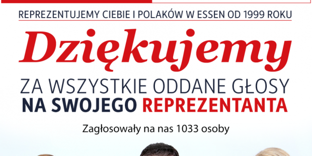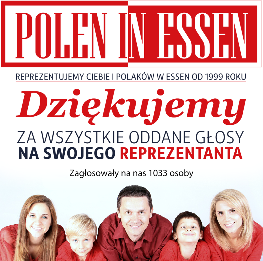 Serdeczne podziękowania dla wszystkich, którzy zaangażowali się w promowanie grupy POLEN IN ESSEN w wyborach do Rady Integracyjnej Miasta Essen. Wg wstępnych wyników uzyskaliśmy 1033 głosy (przeszło dwukrotnie więcej aniżeli inna grupa polonijna z Essen). Wynik ten daje 1 mandat dla Bożeny Wisłockiej, której serdecznie gratulujemy. Dziękujemy za każdy oddany głos, za każdą przekazaną informację czy udostępniony post, za każdy i każde , za każde przekazanie ulotki i za wszystkie inne działania na rzecz POLEN IN ESSEN Teraz staje przed nami ogromne zadanie, by sprostać zaufaniu, jakim zostaliśmy obdarzeni – będziemy się starać na ile tylko sił starczy.