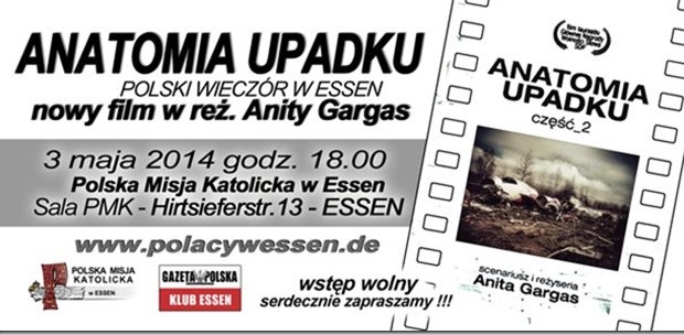 Essen – projekcja filmu red. Anity Gargas pt. “Anatomia upadku cz. 2”, 3 maja… Essen – projekcja filmu red. Anity Gargas pt. “Anatomia upadku cz. 2”, 3 maja, g. 18 w sali parafialnej Polskiej Misji Katolickiej. kw. 28, 2014 Kluby GP Essen (Niemcy) Tagged Anatomia Upadku, Anita Gargas, Essen (Niemcy), projekcja Wstecz Wrocław – spotkanie z Dawidem Jackiewiczem liderem listy PiS w wyborach do PE, 17 maja… Dalej Polonia pamięta – Obchody IV Rocznicy Katastrofy Smoleńskiej w USA (wideo)