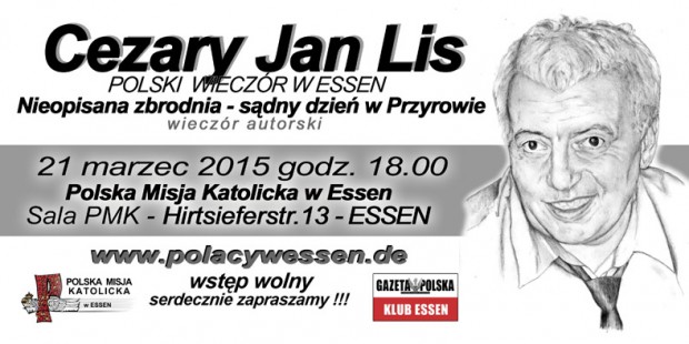 Essen – wieczór autorski Cezarego Jana Lisa pt. ”Niepisana zbrodnia – sądny dzień w Przyrowie”, 21 marca, g. 18, Polska Misja Katolicka, Sala PMK, Hirtsieferstr. 13.