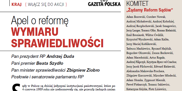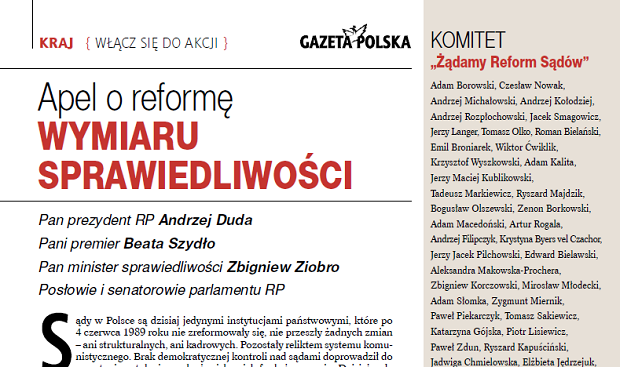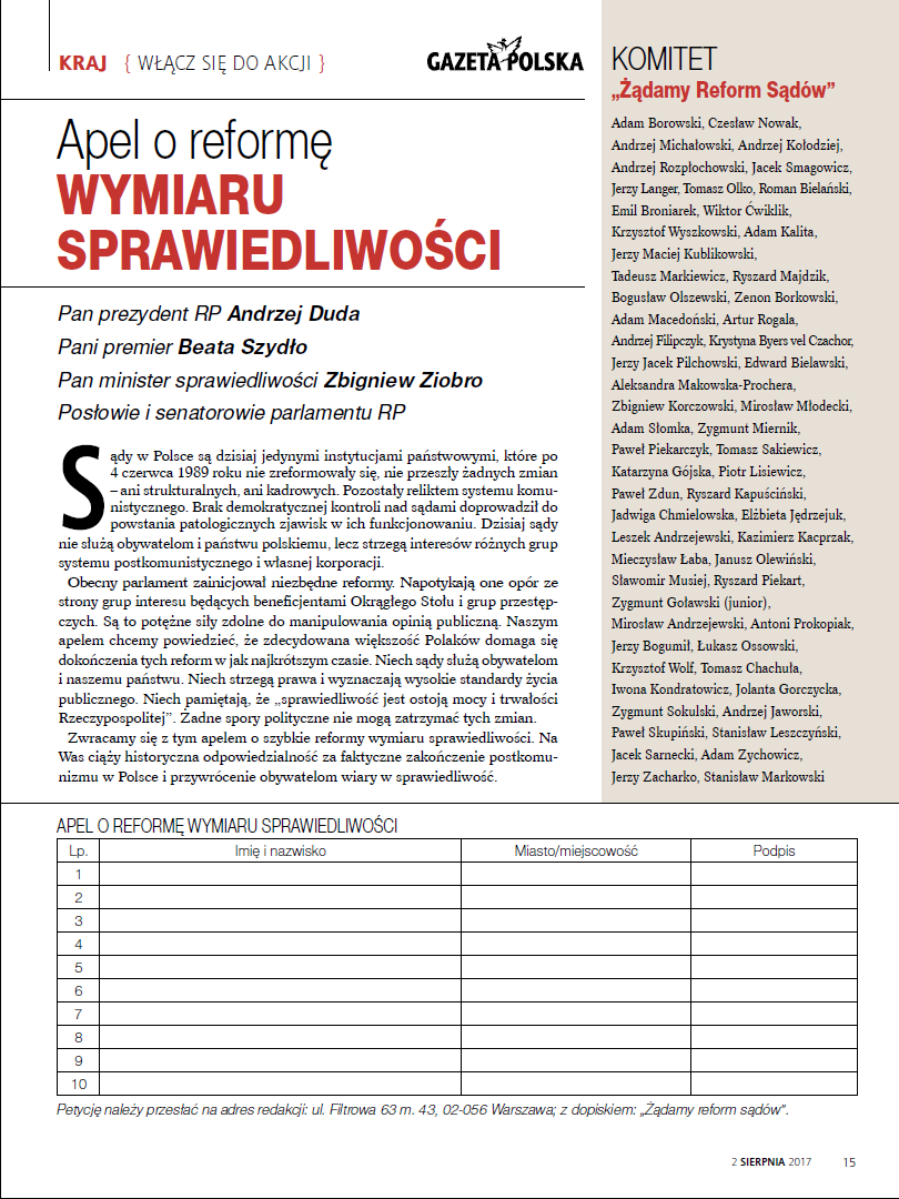 Podpisy w wersji papierowej należy wysyłać na adres redakcji „Gazety Polskiej”: ul. Filtrowa 63/43, 02-056 Warszawa, z dopiskiem „Żądamy Reformy Sądów”.