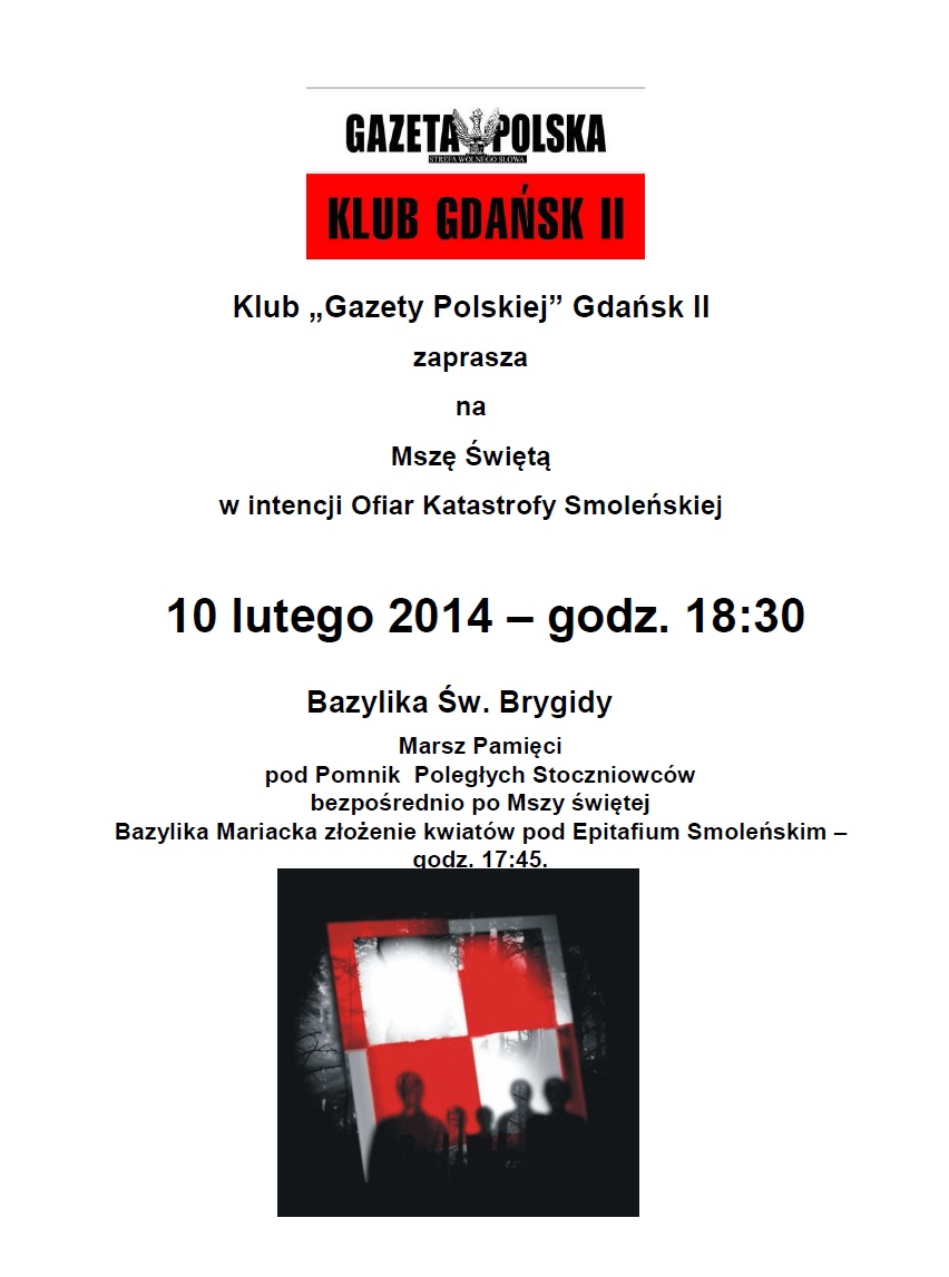 GdanskII_ 12luty2015ańsk II – miesięcznica tragedii smoleńskiej, 10 lutego, g. 17.45. złożenie kwiatów pod Epitafium Smoleńskim w Bazylice Mariackiej, godz.18.30 Msza św. w intencji Ofiar tragedii smoleńskiej, Bazylika św. Brygidy. około 19:30 marsz pamięci.